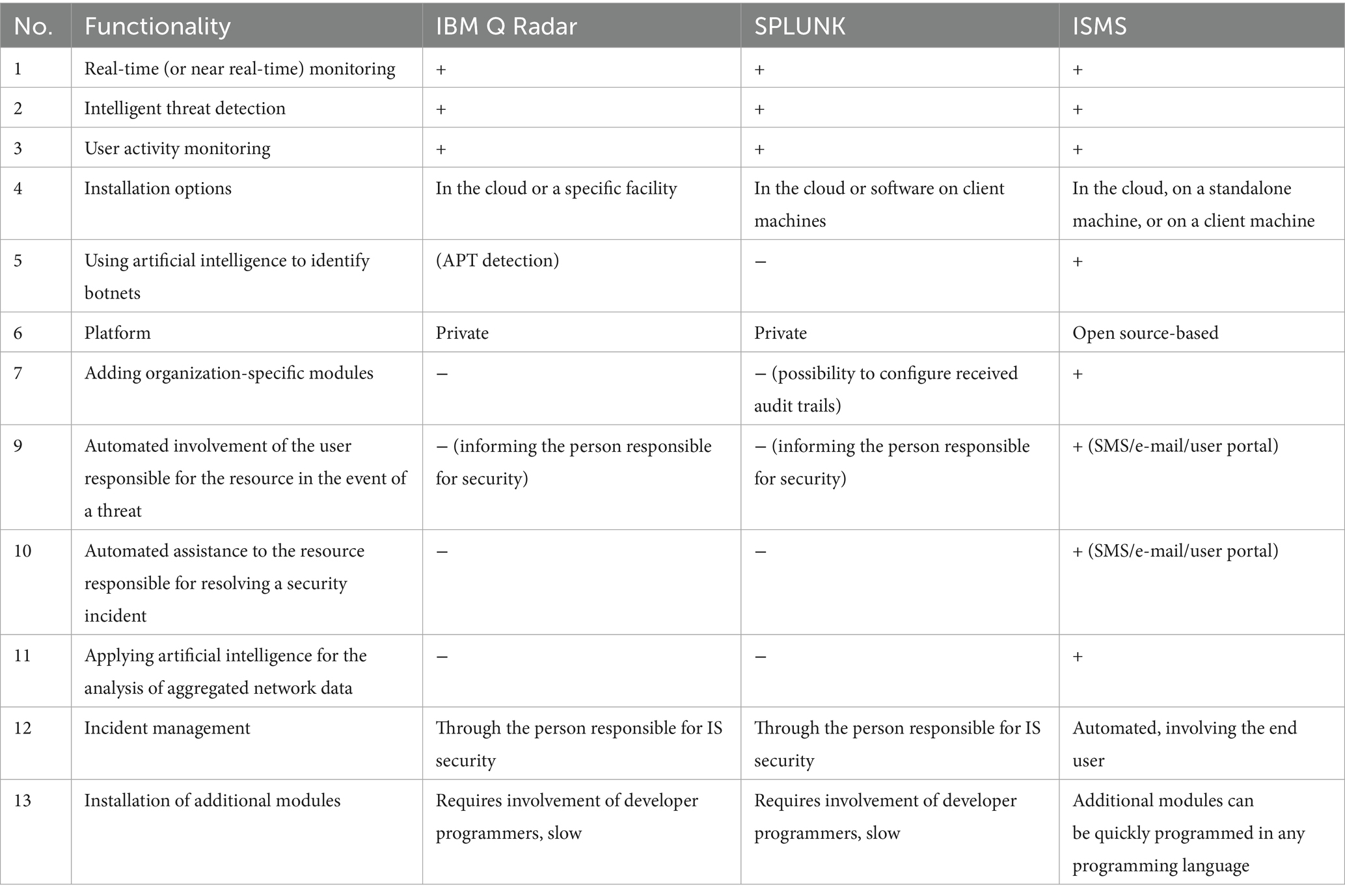 The comparative analysis evaluates the ISMS system with two leading commercial solutions [according to Gartner Magic Quadrant leadership benchmarks (IT Security Demand, n.d.)], IBM QRadar and Splunk, based on 13 functional criteria (Table 6). All three tools provide real-time (or near real-time) monitoring, intelligent threat detection, and user activity monitoring. In terms of deployment flexibility, IBM QRadar and Splunk are limited to cloud or specific facility/software installations, whereas the ISMS system supports deployment in the cloud, on standalone machines, or on client systems.