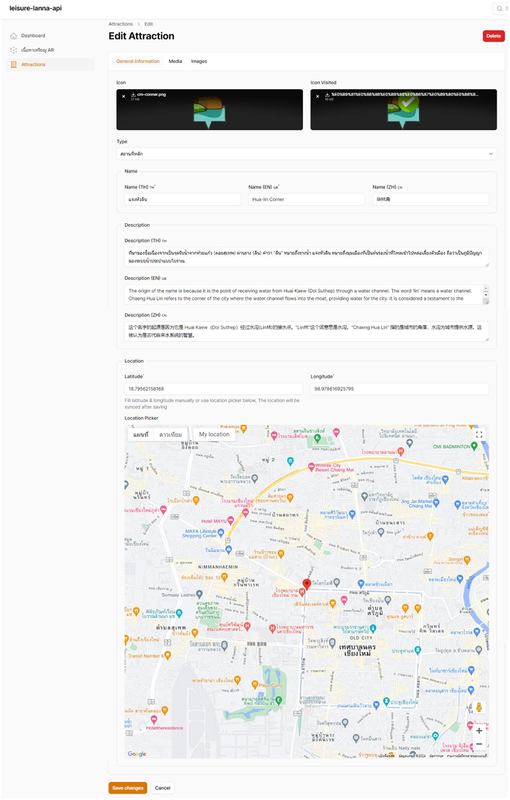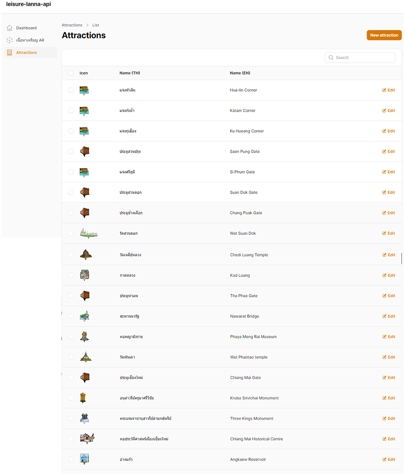 In the application the content of Chiang Mai was employed, the cultural capital of Northern Thailand, was founded in 1296 by King Mangrai as the new capital of the Lanna Kingdom, a powerful city-state in Southeast Asia known for its rich cultural heritage and strategic location in the Ping River basin (Wyatt, 1984). The city was strategically built as a center of commerce and religion, protected by its walls and moat, which remain a testament to its historical significance. Among the 25 key points of interest in Chiang Mai's Old Town, the Three Kings Monument stands prominently, honoring King Mangrai and his alliances with neighboring rulers, while Wat Phra Singh and Wat Chedi Luang represent the region's deep-rooted Buddhist traditions. The Tha Phae Gate, once the city's eastern entrance, served as a vital hub for trade and diplomacy. Other notable landmarks include Chiang Mai Gate, Chang Phuak Gate, and Suan Dok Gate, each with unique historical stories tied to the city's defense and development. Additionally, Suan Prung Gate and the Waroros Market showcase the city's evolving cultural and economic identity. These landmarks, alongside religious sites like Wat Suan Dok and Wat Chiang Man, reflect the Lanna Kingdom's historical grandeur and continuing legacy. The Lanna Passport app presents this content in three languages in Thai, English, and Chinese providing an immersive and accessible experience for tourists from diverse backgrounds.