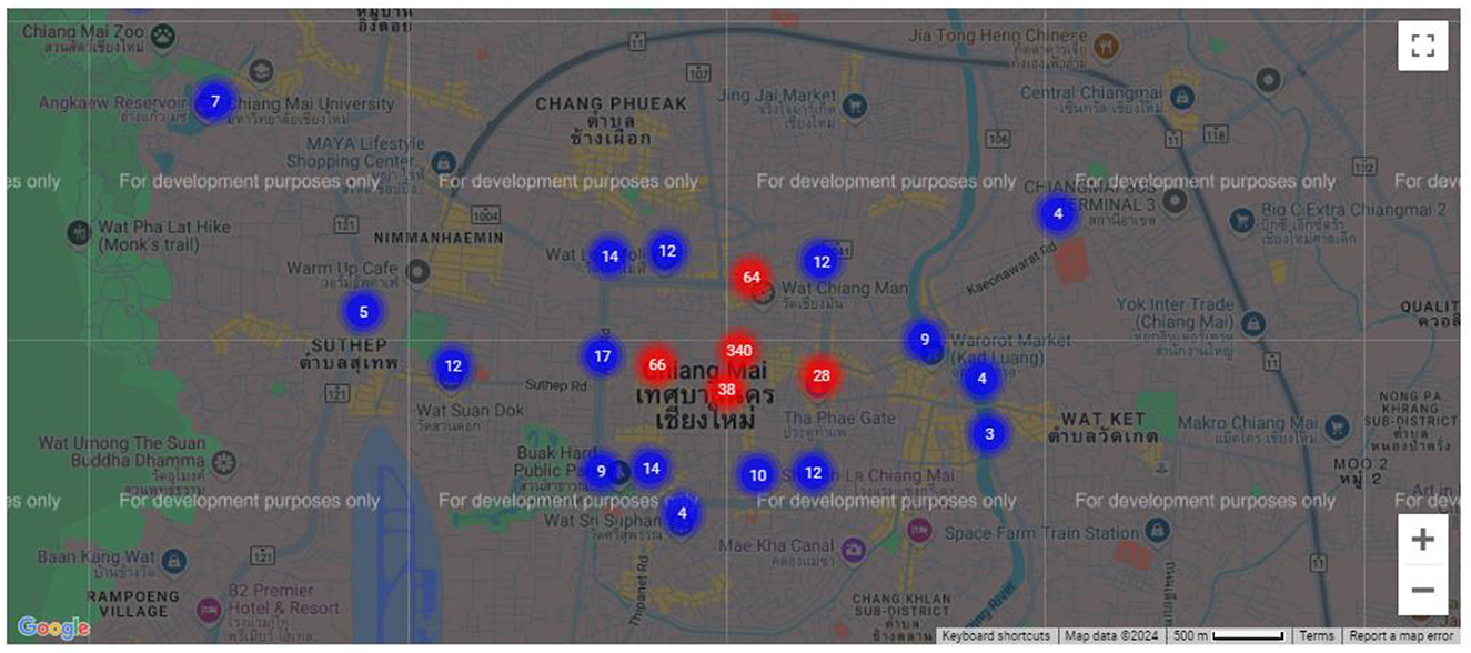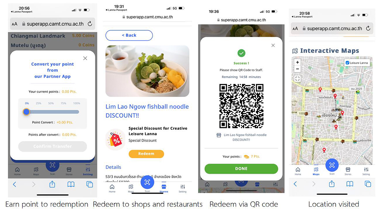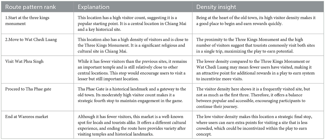 This confirms that the app not only digitizes existing “classic” visitor flows in Chiang Mai's Old Town but also structures them into explicit play-and-earn circuits, reinforcing the role of iconic landmarks as anchors in the tourist spatial experience (Buhalis and Law, 2008; Dias and Afonso, 2021). At the same time, the reward system successfully draws users toward less-visited but thematically linked locations such as local markets and minor temples thus easing pressure on the most crowded sites and distributing benefits to a wider set of community businesses (Evagelou et al., 2022; Hartatik et al., 2022; Hussein and Ahmed, 2022).
