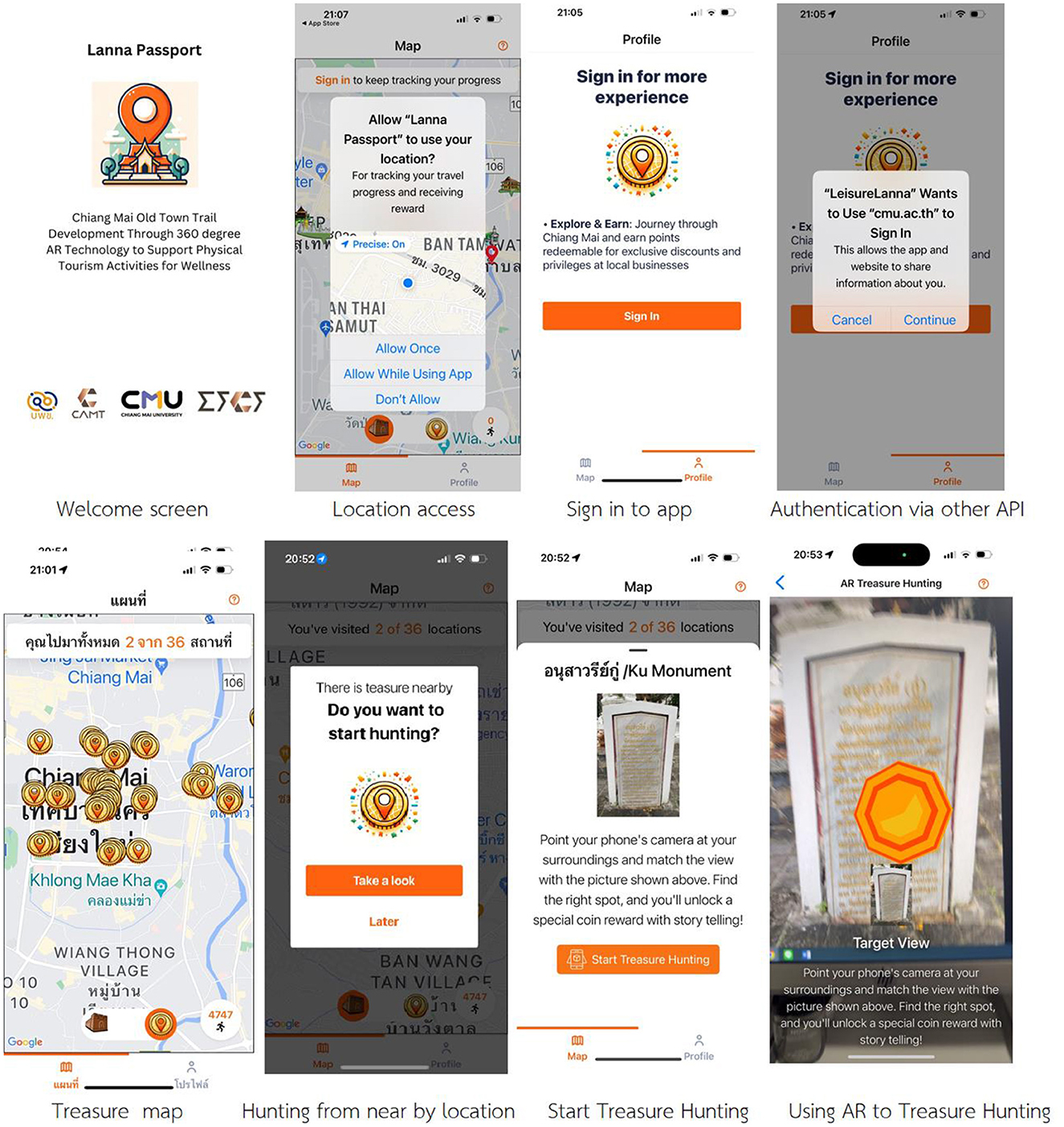 The Lanna Passport mobile application was developed using Flutter to ensure cross-platform compatibility (iOS and Android). The app integrated AR elements, gamification mechanics, and Soundscape experiences designed specifically for enhancing tourism within Chiang Mai Old Town.