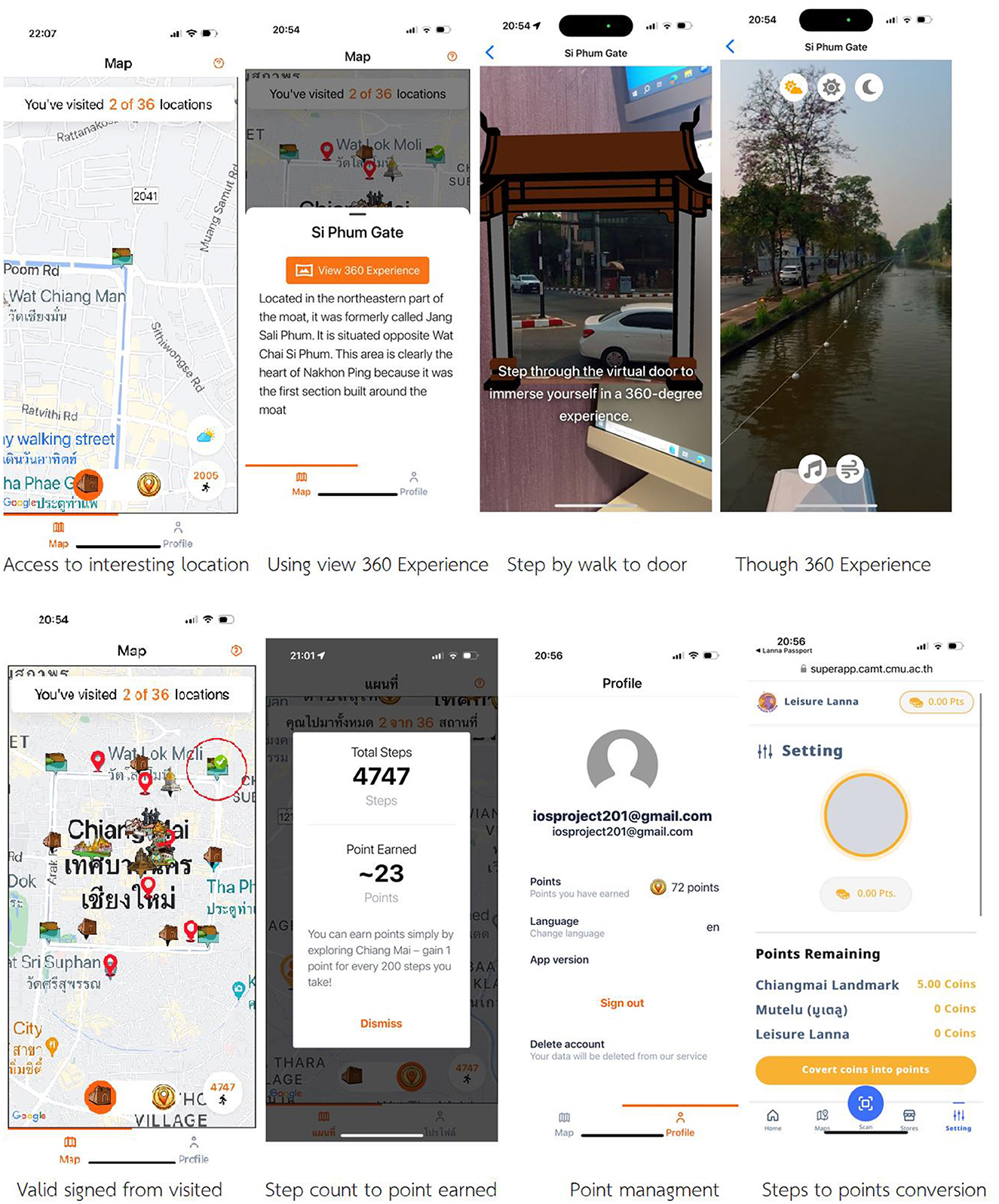 This research focuses on developing a system within the Lanna Passport application to enhance user experiences with tourism in key locations across Chiang Mai City. The system features content that includes 360-degree Photo Scape images taken at different times of the day-morning, afternoon, and night allowing users to see tourist attractions from various perspectives. It also incorporates soundscapes to provide an immersive audio experience that complements the visual content. Each tourist attraction is connected to reference points for walking, running, or cycling activities within the old city area, following the play to earn concept. The research scope includes synthesizing routes and tourist attractions in Chiang Mai's old city, with details summarized in the Table 3 below.