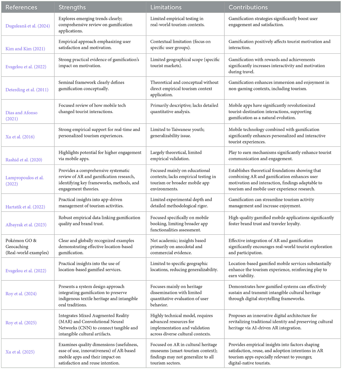 The following table provides a detailed critical evaluation of key literature supporting the integration of gamification and augmented reality within mobile tourism apps. Each reference is analyzed to highlight its strengths, limitations, and significant contributions, offering a comprehensive synthesis to better understand the effectiveness and practical implications of the play to earn concept.