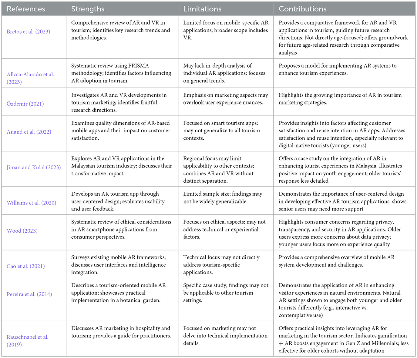 Recent studies have critically evaluated the role of AR in mobile tourism which shown in Table 2. Bretos et al. (2023) provide a comparative review of AR and VR technologies, highlighting research trends, although their focus is broader and not exclusively mobile. Allcca-Alarcón et al. (2023) use the PRISMA method to systematically identify factors affecting AR adoption, offering a foundational implementation model. Meanwhile, Özdemir (2021) emphasizes AR's growing role in tourism marketing, although the user experience dimension is underexplored.