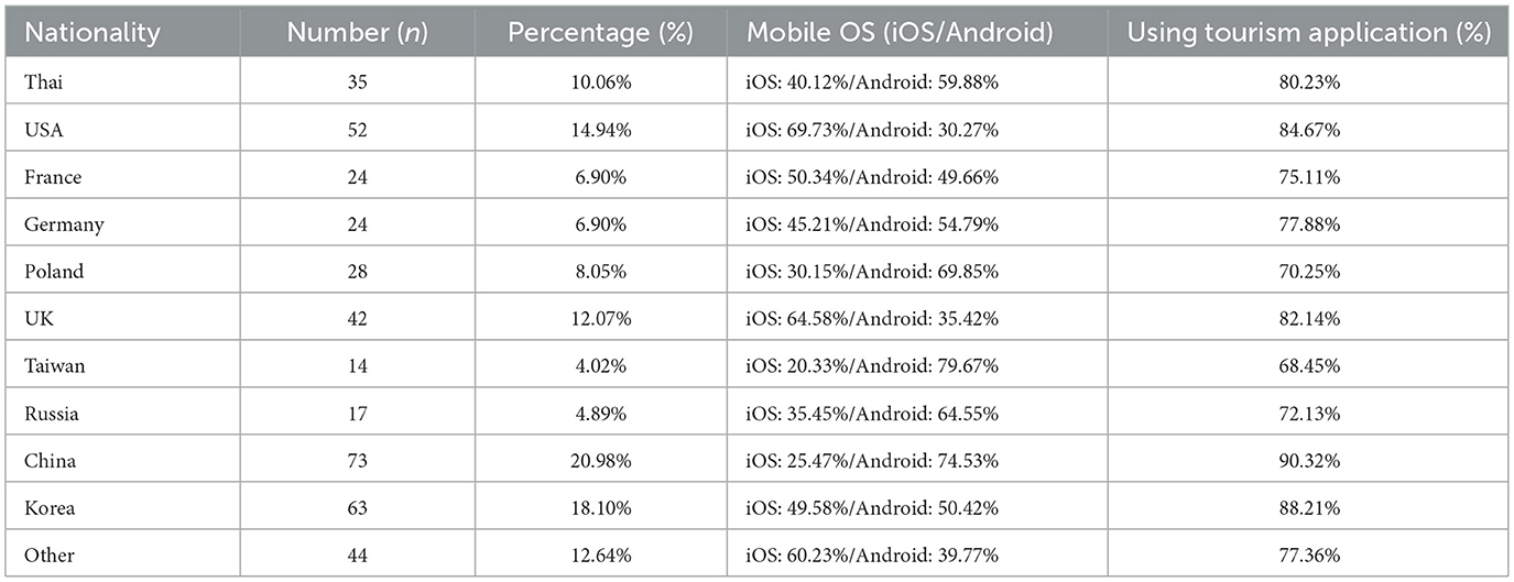 The demographic composition of participants (n = 347) was diverse, covering a wide range of age groups, nationalities, and familiarity with mobile applications. Detailed demographic data were collected, including gender, age, nationality, and mobile operating system preferences (iOS or Android), to enable a thorough analysis of user preferences and interactions.