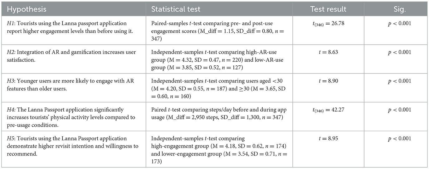 Noted: Although all 347 participants used the Lanna Passport app, Hypothesis H1 (“Tourists using the Lanna Passport application will report higher engagement levels than those not using it”) was assessed through a pre–post within-subject design. Participants completed baseline questions on engagement intention before using the app and a post-usage survey after exploration. The comparison of mean engagement scores before and after usage validated the hypothesis. This approach aligns with similar mobile tourism experiments (Kim and Park, 2017).