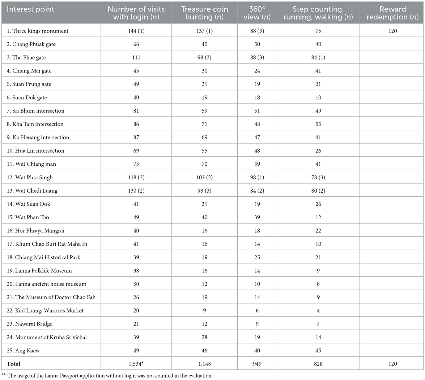 Beyond hypothesis testing, the analyses of back-end log data provide concrete insights into how tourists actually utilize the innovation in each location. Between March and May 2024, over 80% of observed movements followed a relatively stable route pattern linking high-density heritage nodes such as the Three Kings Monument, Wat Chedi Luang, and Tha Phae Gate, where AR treasure hunts, 360-degree scenes, and reward redemption were most frequently activated.