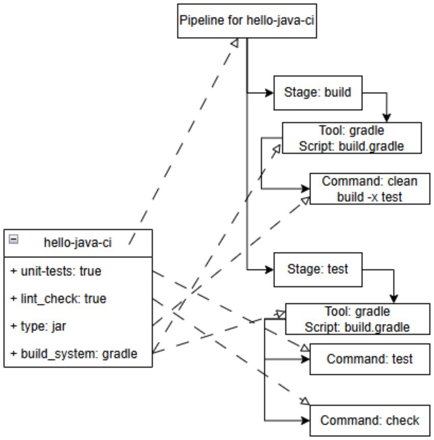 The comprehensive analysis indicates that System Architecture domain abstractions, expressed through Software Models and Deployment Models using UML Class and UML Deployment notations respectively, are suitable input artifacts and models. The concept of code generation from models sought to reduce manual coding errors and rework, thereby improving software quality and accelerating the development process. The principles of Model-Driven Engineering (Schmidt, 2006) are applied to the definition of the meta-models and model transformation. The required software architecture model in UML Class diagram notation is shown on the left side of Figure 2. The application’s name is “hello-java-ci,” which also serves as the name for both the Git repository and the pipeline itself. In this current example, the Java application or library has the following parameters: unit-tests (binary value), lint_check (binary value), type (string value), and build_system (string value).