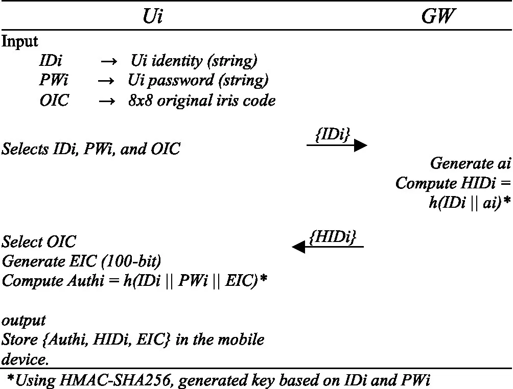 This scheme has a registration authority, several smart sensing devices, a gateway node (GW), and several users. The process starts with secure offline registration of each smart device and legal users. The users need to register at the registration authority, providing his/her necessary information. Each user has a smartphone, which is capable of reading the credential information, such as the user’s identity, password, and biometric. The biometric used in this scheme is iris, which is considered the most reliable biometric for authentication. The steps of using biometrics are mentioned below. The following section provides a description of the proposed scheme in detail.