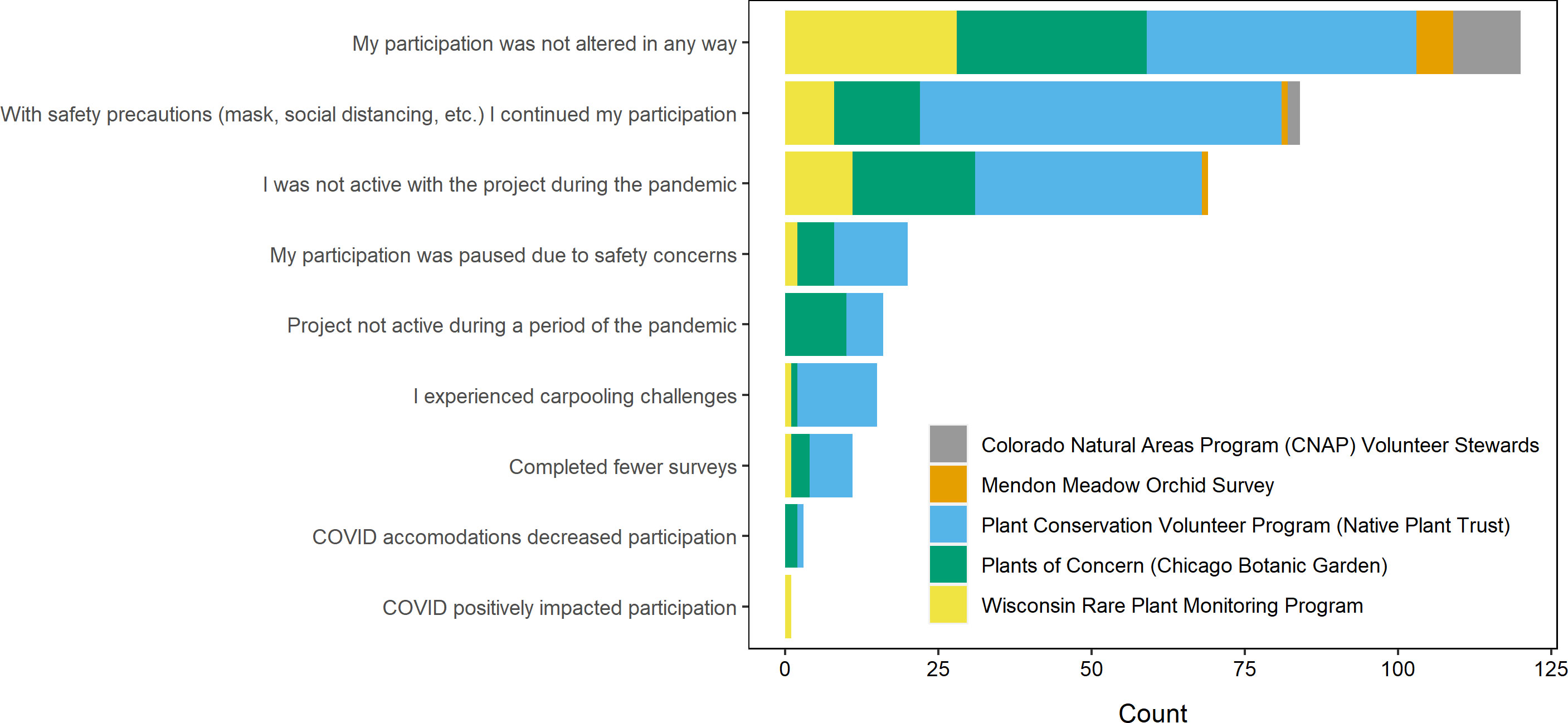 Survey responses were categorized into nine bins to describe the impact of COVID-19 on project participation (Figure 9). The majority of respondents indicated that their participation was not altered in any way (n = 120, 35%). About one-quarter of respondents (84, 25%) were able to continue participating with COVID safety precautions in place (e.g., masking and social distancing). In one case, COVID was reported to positively impact project participation.