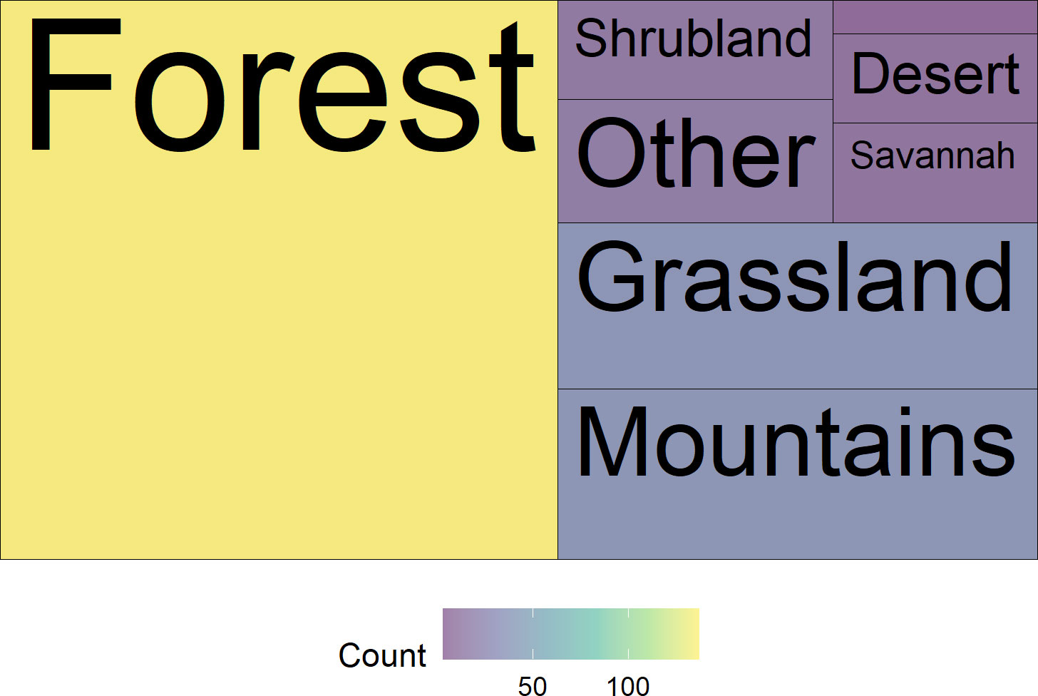 Figure 6 Treemap of the number of papers per habitat type. The label is omitted from the smallest category in the upper righthand corner, “Wetland and riparian” (n=3). “Other” includes categories such as “home gardens,” “coastal,” and “disturbed”.