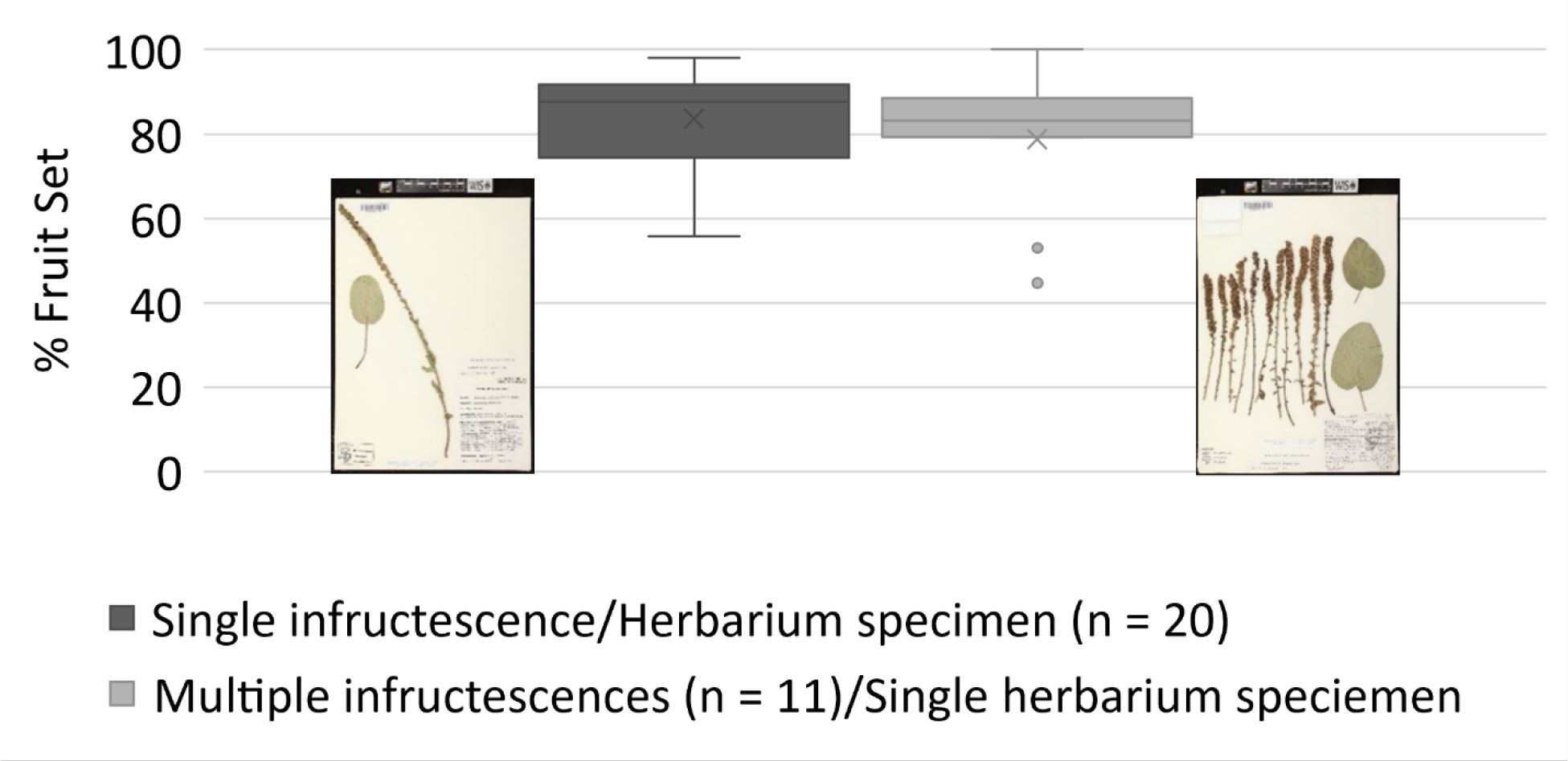 Figure 4 Fruit set estimates for kittentails (Synthyris bullii) at the individual level (i.e., per herbarium specimens) and population level (i.e., multiple infructescences per herbarium specimens per site). Fruit set estimates followed Chi and Molano-Flores (2014). Images from the Wisconsin State Herbarium (WIS).