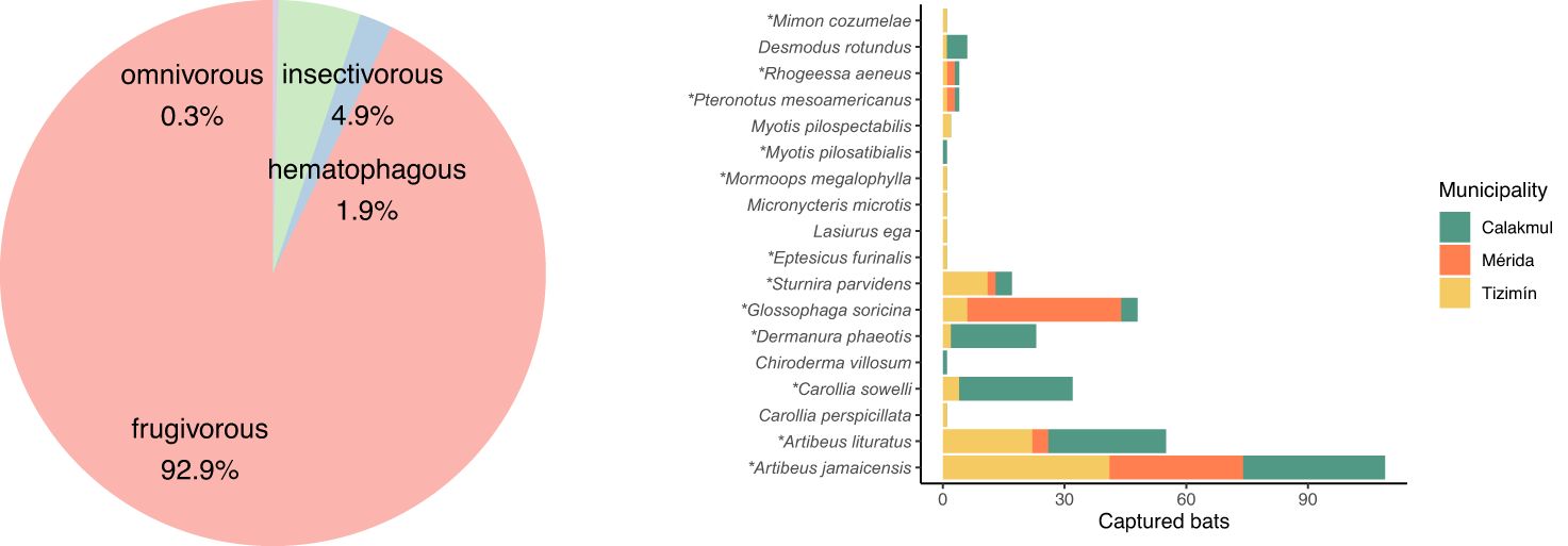 Figure 3. Identified bat species and associated feeding strategies. Proportion of observed bats per feeding strategy (left). Number of bats per species among conserved, agricultural and urban landscapes, which respectively correspond to Calakmul, Tizimín and Mérida (right). Bracket colors according to the feeding strategists indicated in the pie chart. Asterisks show bat species assessed in the gut microbiome analysis.