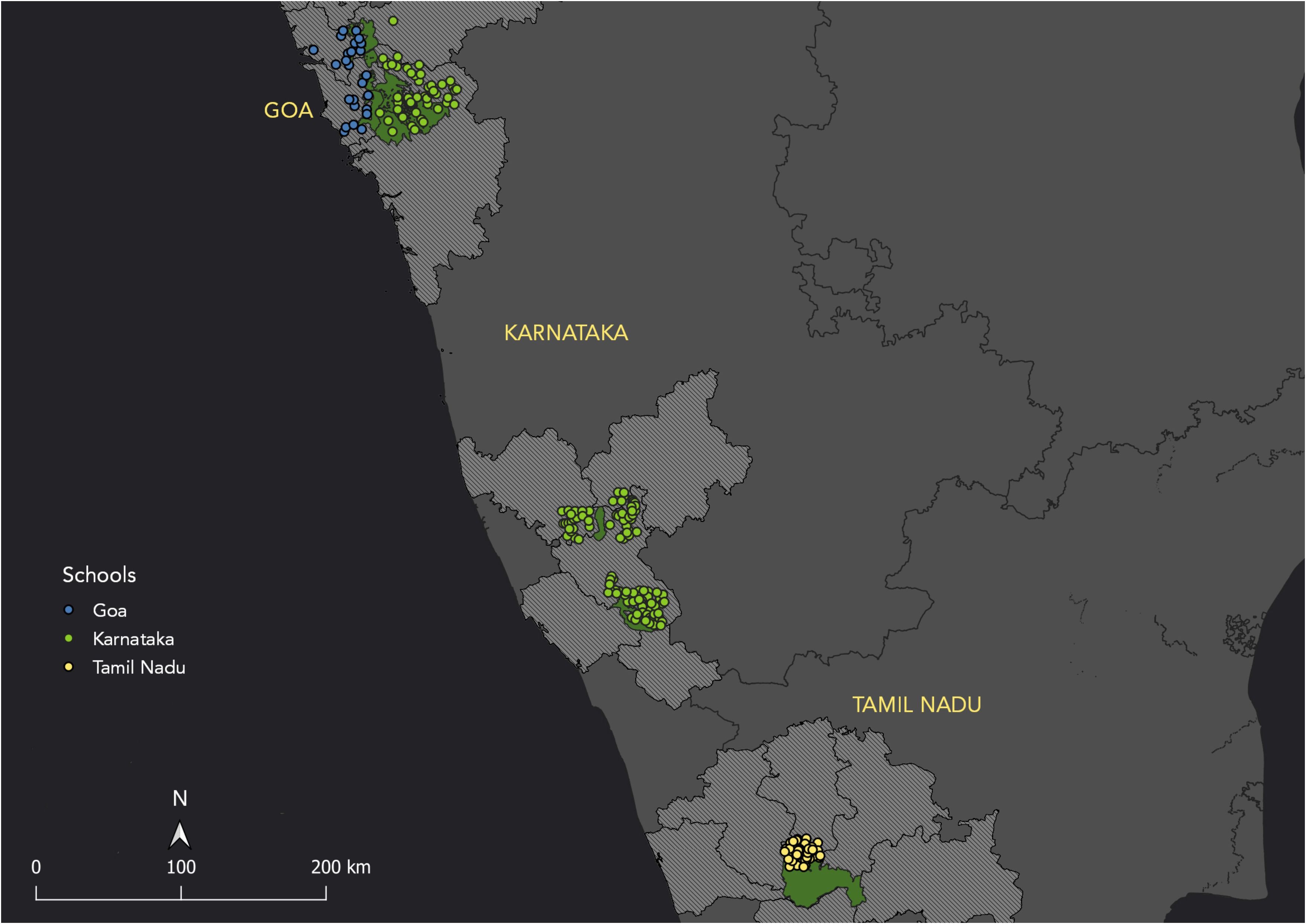 Figure 1. Map indicating the schools where Wild Shaale modules were conducted in Goa, Karnataka and Tamil Nadu.