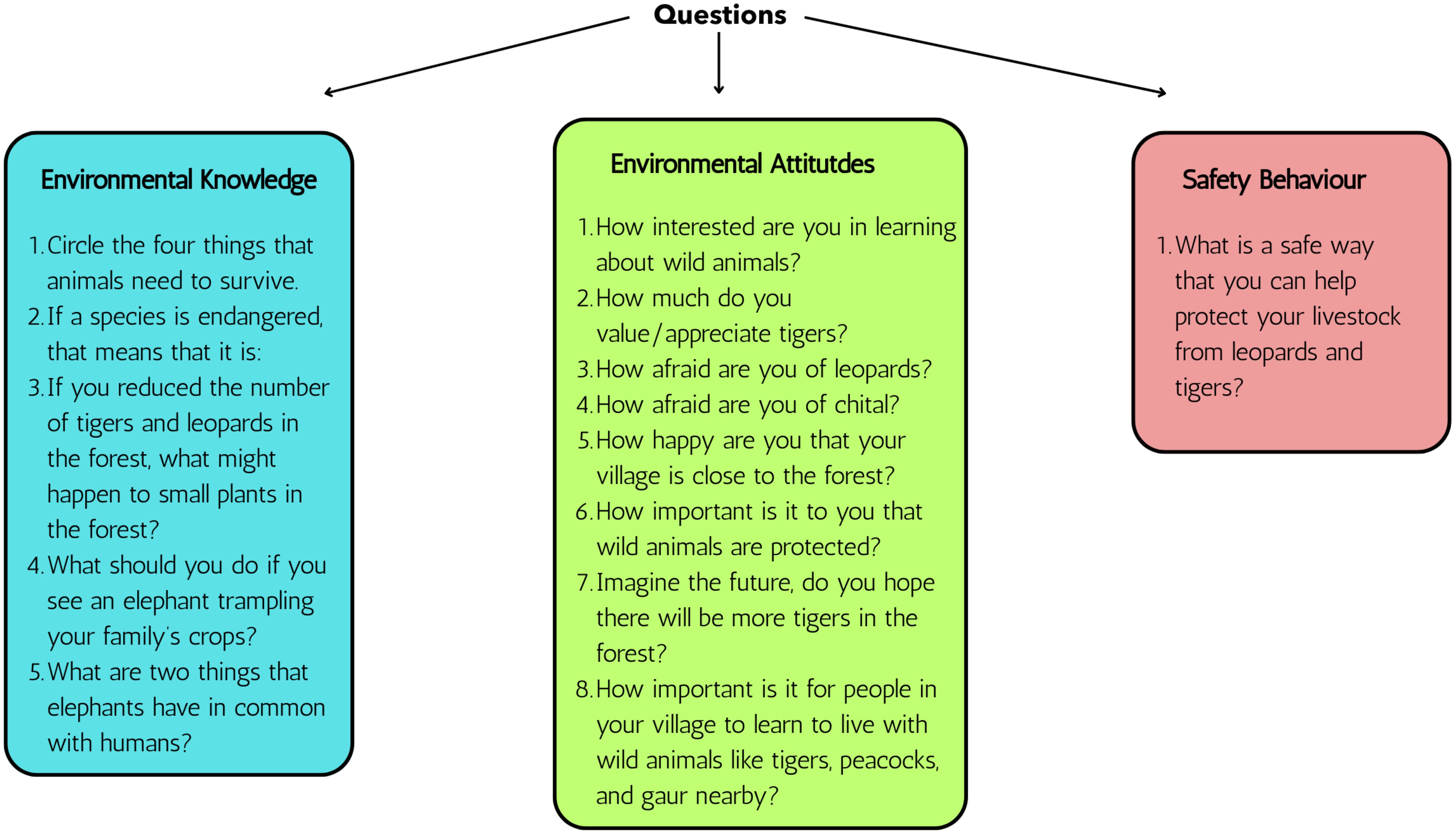 Figure 2. The list of questions asked to evaluate the different aspects of children’s knowledge and attitudes towards wildlife and ecosystems. The question asking about fear of chital (spotted deer) was included to check whether students were reading the questions carefully; we anticipated that they would be less afraid of chital than leopards.