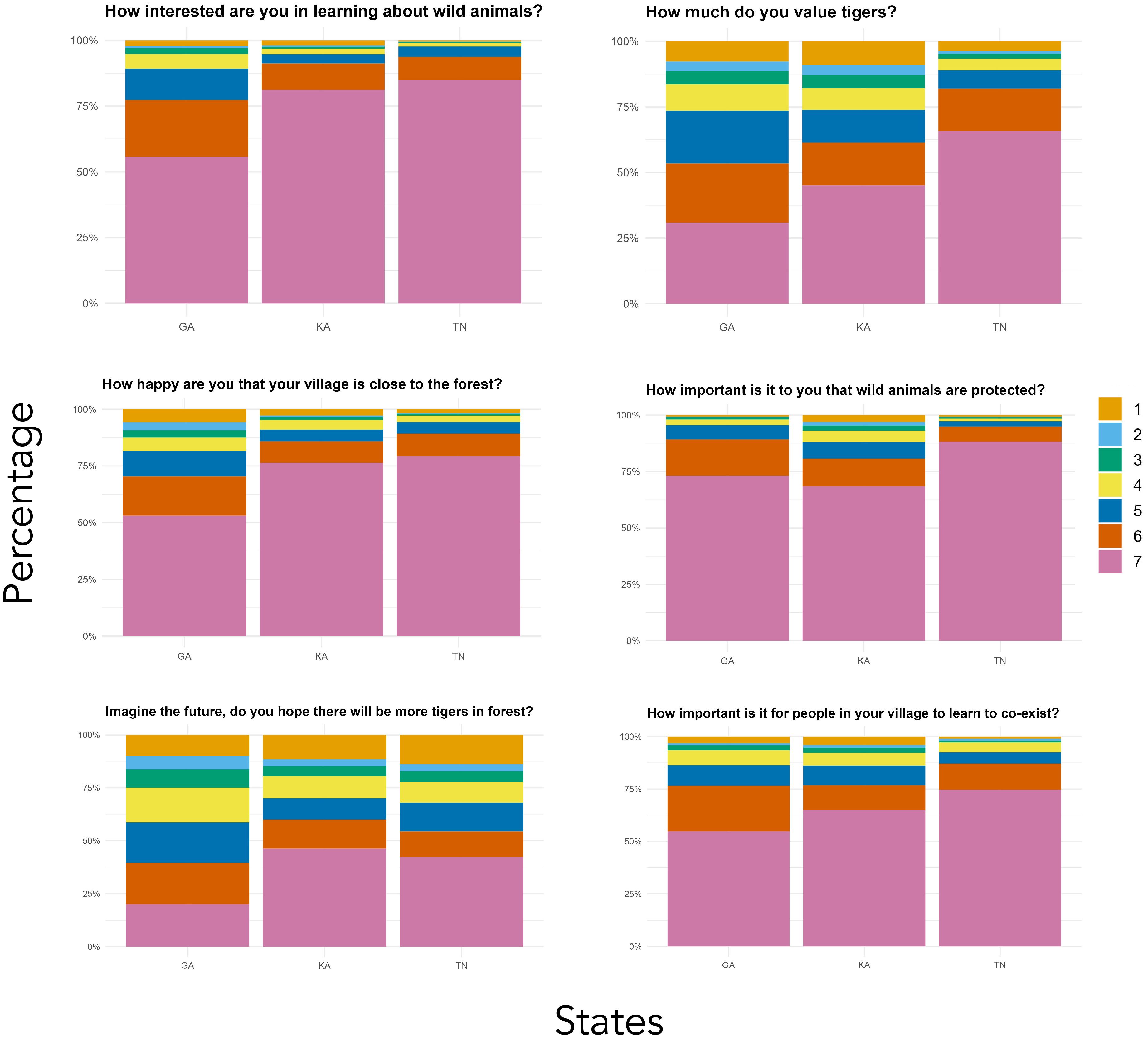 Overall, we found that Karnataka and Tamil Nadu seemed to have a more positive baseline attitude towards wildlife in general compared to Goa (Figure 3; Table 1; Supplementary Table S1). This was more pronounced in questions such as “How interested are you in learning about wild animals”, “How happy are you that your village is close to the forest?”, “How much do you value/appreciate tigers?” and “Imagine the future, do you hope there will be more tigers in the forest?”. For example, for the question, “How interested are you in learning about wild animals”, more than 75% students responded with 7 (most positive response) on the Likert scale in Karnataka and Tamil Nadu, whereas only about 55% students responded with 7 in Goa. Similarly for the question, “How much do you value tigers?”, only about 25% students from Goa responded with 7 on Likert scale while this was about 45% for Karnataka and 65% for Tamil Nadu. These findings align with the regression coefficients, which showed significantly higher odds of more positive responses in Karnataka and Tamil Nadu compared to Goa (Table 1; Supplementary Table S1). Students in Tamil Nadu had exceptionally positive responses to two questions with about 80% students responding with 7 for the question, “How interested are you in learning about wild animals” and about 65% students responding with a very positive 7 for the question “How much do you value tigers?”, where students from Karnataka also had only 45% respond with 7 (Figure 3; Tables 1, S1).