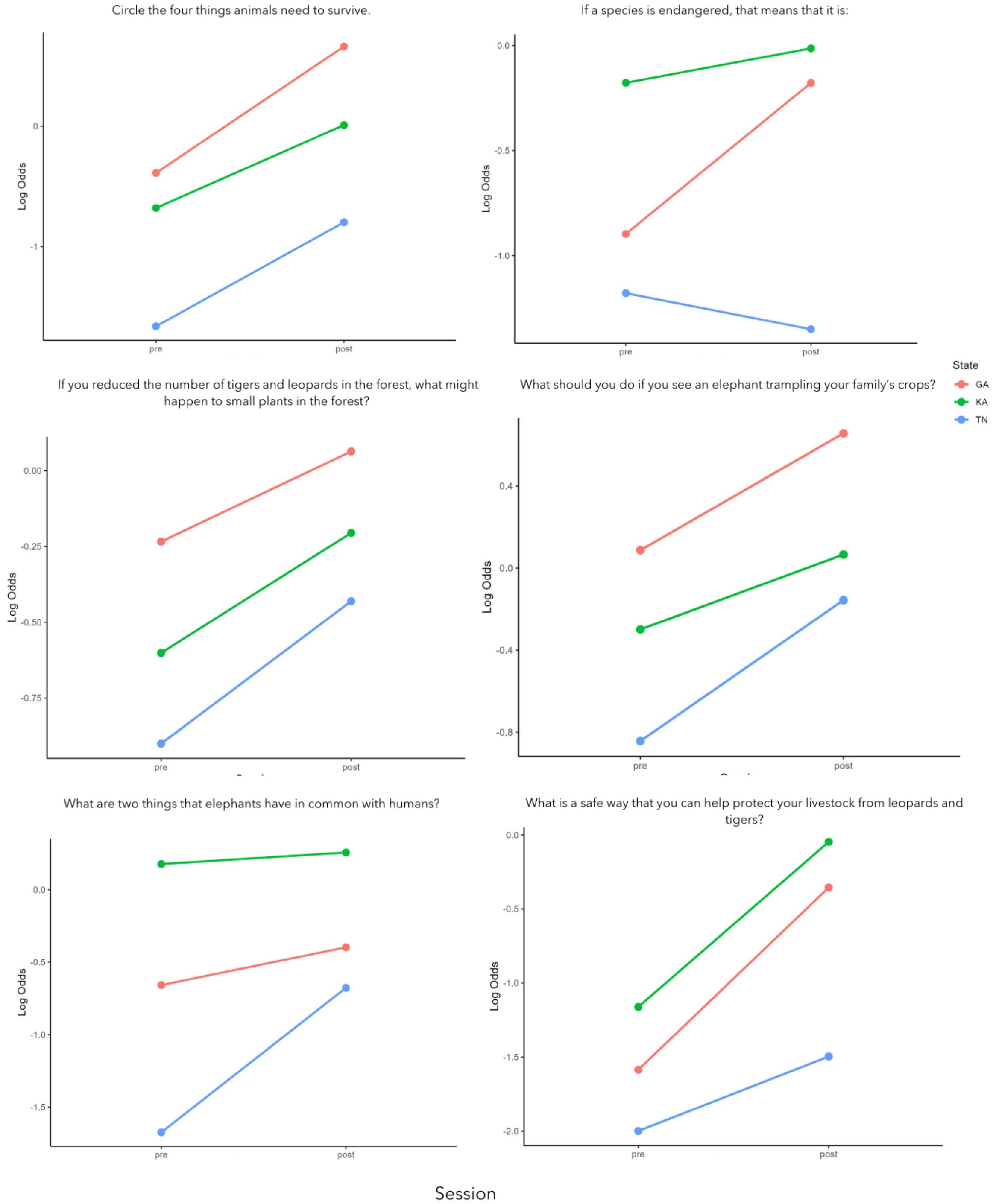 Figure 4. Pairwise comparisons of predicted probabilities (expressed as odds ratios) across states and sessions. For Question, “Circle the four things that animals need to survive.”, within-state comparisons between post and pre revealed significant increases in all three states: GA (OR = 2.86, p < 0.0001), KA (OR = 1.99, p < 0.0001), and TN (OR = 2.38, p < 0.0001). In the pre-session, GA participants had higher odds than TN (OR = 3.58, p < 0.0001) and KA (OR = 1.34, p = 0.0001). KA also had higher pre-session odds than TN (OR = 2.68, p < 0.0001). For Question, “If a species is endangered, that means that it is:”, within-state pre–post comparisons showed a significant increase in GA (OR = 2.05, p < 0.0001) and KA (OR = 1.18, p = 0.0051), but not in TN (OR = 0.84, p = 0.1923). Pre-session, KA had higher odds than TN (OR = 2.72, p < 0.0001) and GA (OR = 0.49, p < 0.0001); GA also had higher odds than TN (OR = 1.33, p = 0.0031). For Question, “If you reduced the number of tigers and leopards in the forest, what might happen to small plants in the forest?”, within-state comparisons between post and pre revealed significant increases in all three states: GA (OR = 1.35, p = 0.0007), KA (OR = 1.49, p < 0.0001), and TN (OR = 1.6, p < 0.0001). In the pre-session, GA participants had higher odds than TN (OR = 1.95, p < 0.0001) and KA (OR = 1.44, p = 0.0001). KA also had higher pre-session odds than TN (OR = 1.35, p < 0.0001). For the Question: “What should you do if you see an elephant trampling your family’s crops?”, within-state pre–post comparisons showed a significant increase in GA (OR = 1.77, p < 0.0001), KA (OR = 1.44, p < 0.0001) and TN (OR = 1.99, p < 0.0001). Pre-session, GA had higher odds than TN (OR = 2.54, p < 0.0001) and KA (OR = 1.47, p < 0.0001); KA also had higher odds than TN (OR = 1.71, p < 0.0001). For the Question: “What are two things that elephants have in common with humans?”, within-state comparisons between post and pre revealed significant increases in all three states: GA (OR = 1.3, p = 0.007), and TN (OR = 2.71, p < 0.0001) but not KA (OR = 1.1, p =0.52). In the pre-session, KA participants had higher odds than TN (OR = 6.38, p < 0.0001) and GA (OR = 0.43, p < 0.0001). GA also had higher pre-session odds than TN (OR = 2.77, p < 0.0001). For the Question: “What would be a safe way to protect the livestock against tigers and leopards?”, within-state pre–post comparisons showed a significant increase in GA (OR = 3.42, p < 0.0001), KA (OR = 3.05, p < 0.0001), and TN (OR = 1.65, p < 0.0001). Pre-session, KA had higher odds than TN (OR = 2.31, p < 0.0001) and GA (OR = 0.65, p < 0.0001); GA also had higher odds than TN (OR = 1.51, p = 0.0002).