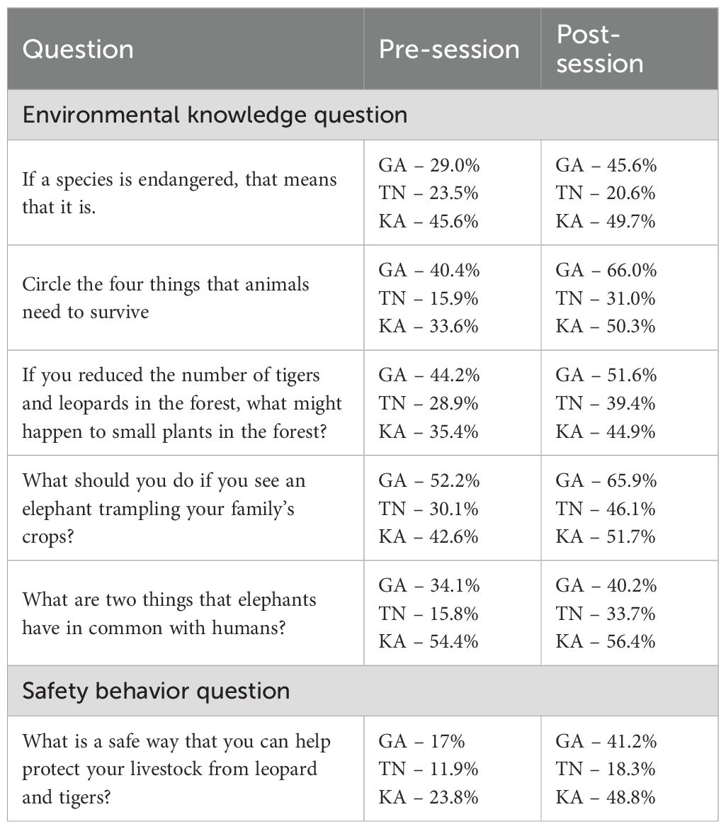 For the question “What are two things that elephants have in common with humans?”, Karnataka had the most correct responses from students (pre session - 54.4%, post session - 56.4%). Students responded with least correct responses for pre-session in Tamil Nadu (15.8%), however, they improved significantly in the post session (33.7%) (Figure 4; Supplementary Table S5).