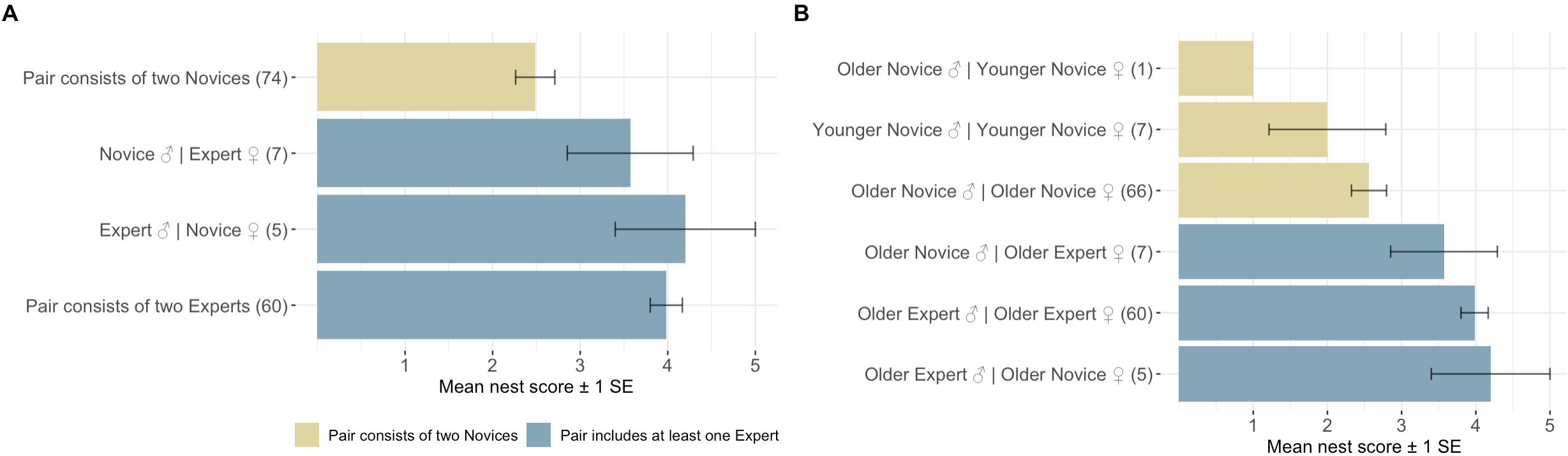 Figure 1. (A) Mean nest scores achieved by pairs containing two novices, one expert, or two experts. These were the experience categories used in the CLMM analysis of nest quality. (B) Mean nest scores achieved across the age-experience classes, assigned to each pair, showing no clear systematic trends with age.