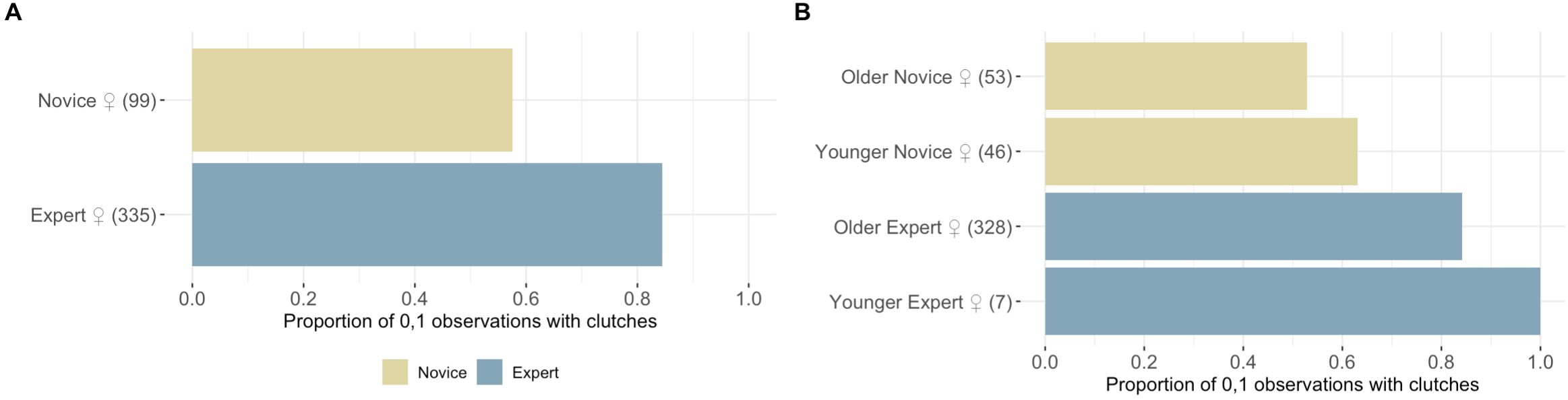 Figure 2. Role of experience and age on clutch production. (A) Clutch production by Novice ♀ and Expert ♀ groups. (B) The proportion of observations with clutches across the age-experience classes assigned to each female included in our analysis, showing a clear pattern with female experience, but no clear systematic trends with age.