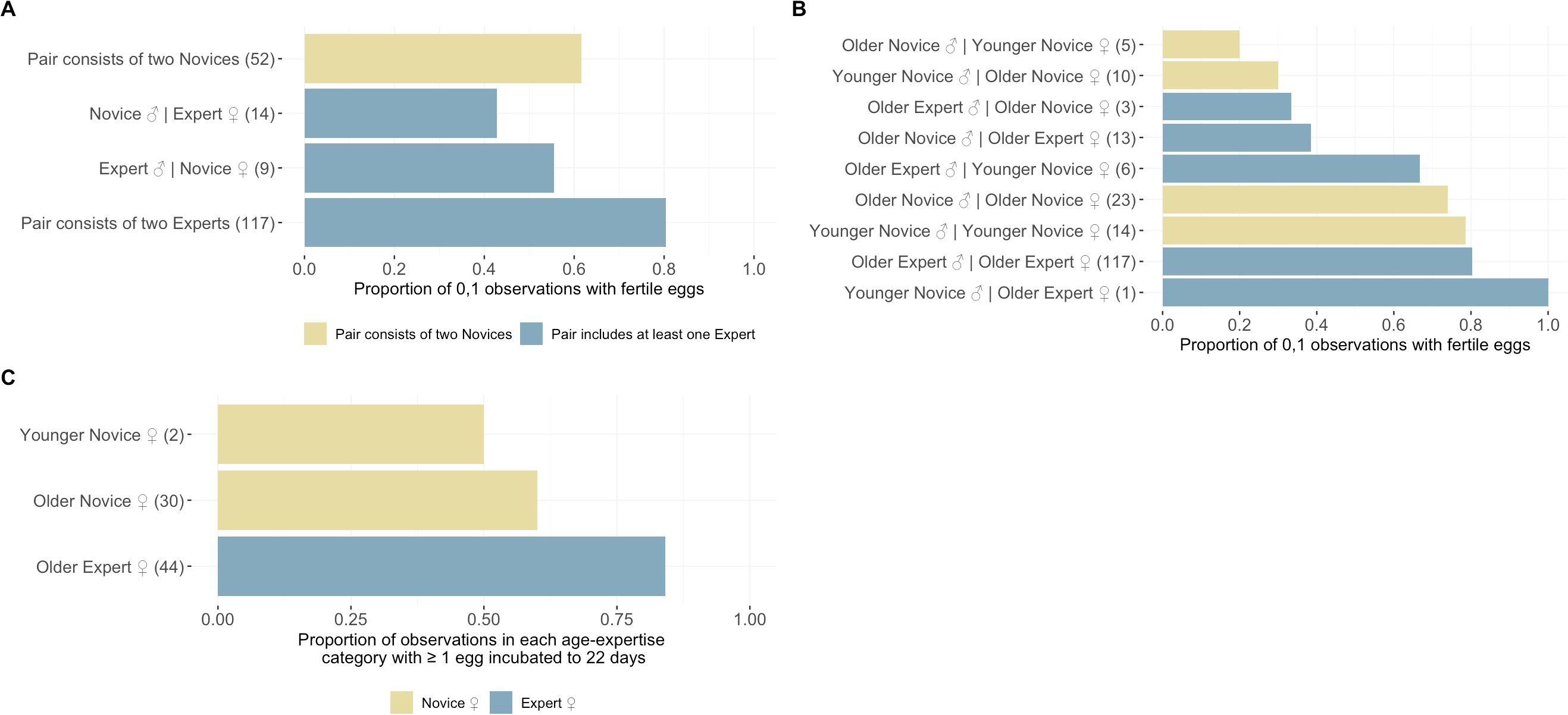 Figure 3. Role of experience and age on egg fertilization. (A) The overall proportion of observations with fertilized eggs among the pair experience groups used in the GLMM of egg fertilization. (B) The proportion of observations with fertilized eggs across the age-experience classes assigned to each female included in our analysis showing no clear systematic trends with experience or age. (C) The overall proportion of observations with eggs incubated among the female age-experience groups. Female experience in this analysis was numerically coded as “Younger Novice ♀” = 0, “Older Novice ♀” = 1, & “Older Expert ♀” = 2 to facilitate standardization with the cumulative proportion of clutches removed prior to running the GLMM analysis.