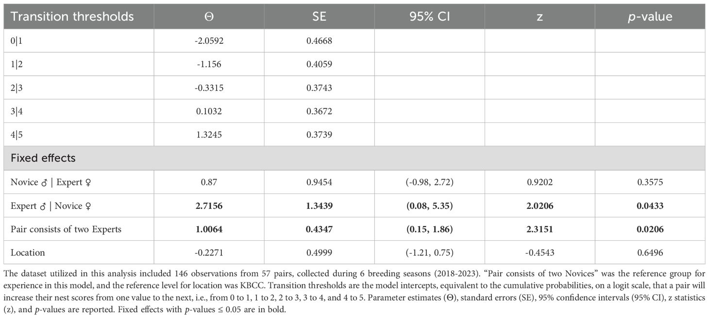 The experience metrics utilized in each analysis varied as described below (but see Supplementary Table S1 for an at-a-glance overview of the data and parameters included in each model). An ordinal cumulative linked mixed model (CLMM) from the ordinal package (Christensen, 2018) was used to test whether experience impacted nest quality scores. The effect of experience on clutch production, egg fertilization, and egg incubation was tested with generalized linear mixed models (GLMMs), conducted with the lme4 package (Bates et al., 2015). Model assumptions of the CLMM and GLMMs were tested with the ordinal (Christensen, 2018) and DHARMa (Hartig, 2022) packages, respectively.