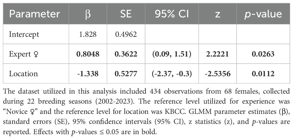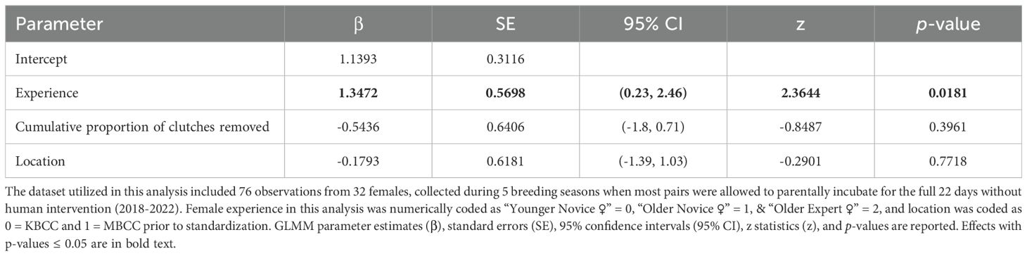 Table 2. Results from the GLMM evaluating whether female experience was predictive of clutch production.