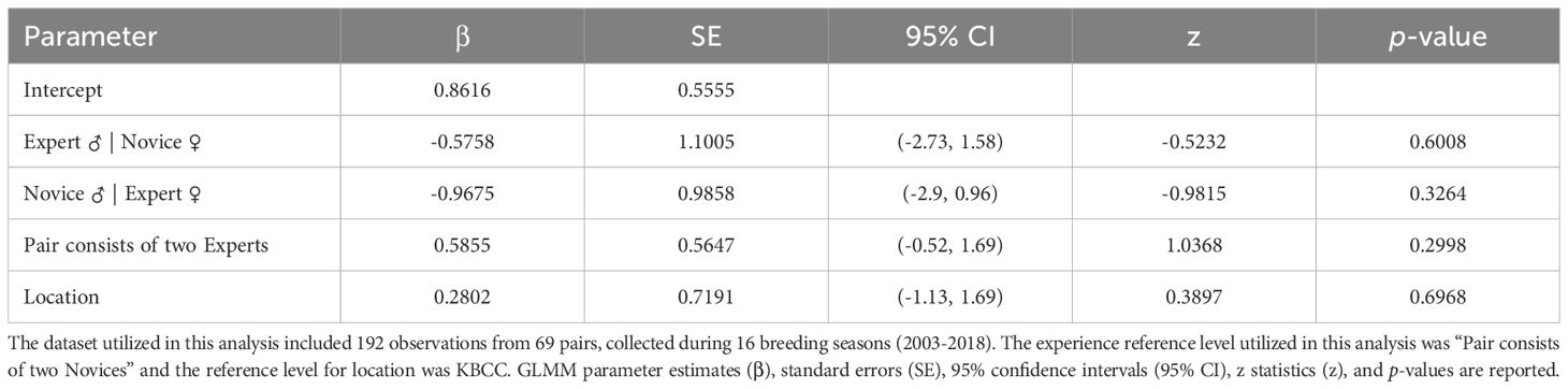 Future investigations that simultaneously explore behavioral compatibility (Alverson et al., 2023; Spoon et al., 2006), genetics and genomics (Hoeck et al., 2015; Kyriazis et al., 2025; Sutton et al., 2018), and experience (Lv et al., 2016; Peralta-Sánchez et al., 2020; Pitera et al., 2021), could provide a deeper understanding of the mechanisms that drive variation in breeding outcomes. Moreover, we were unable to meaningfully assess the impact of previous breeding experience on nestling rearing and survival due to sample size limitations (too few data to compare Novice to Expert breeders), although, we acknowledge that exploring post-hatch outcomes would yield valuable insights into the potential benefits of experience on later stages of the reproductive cycle.