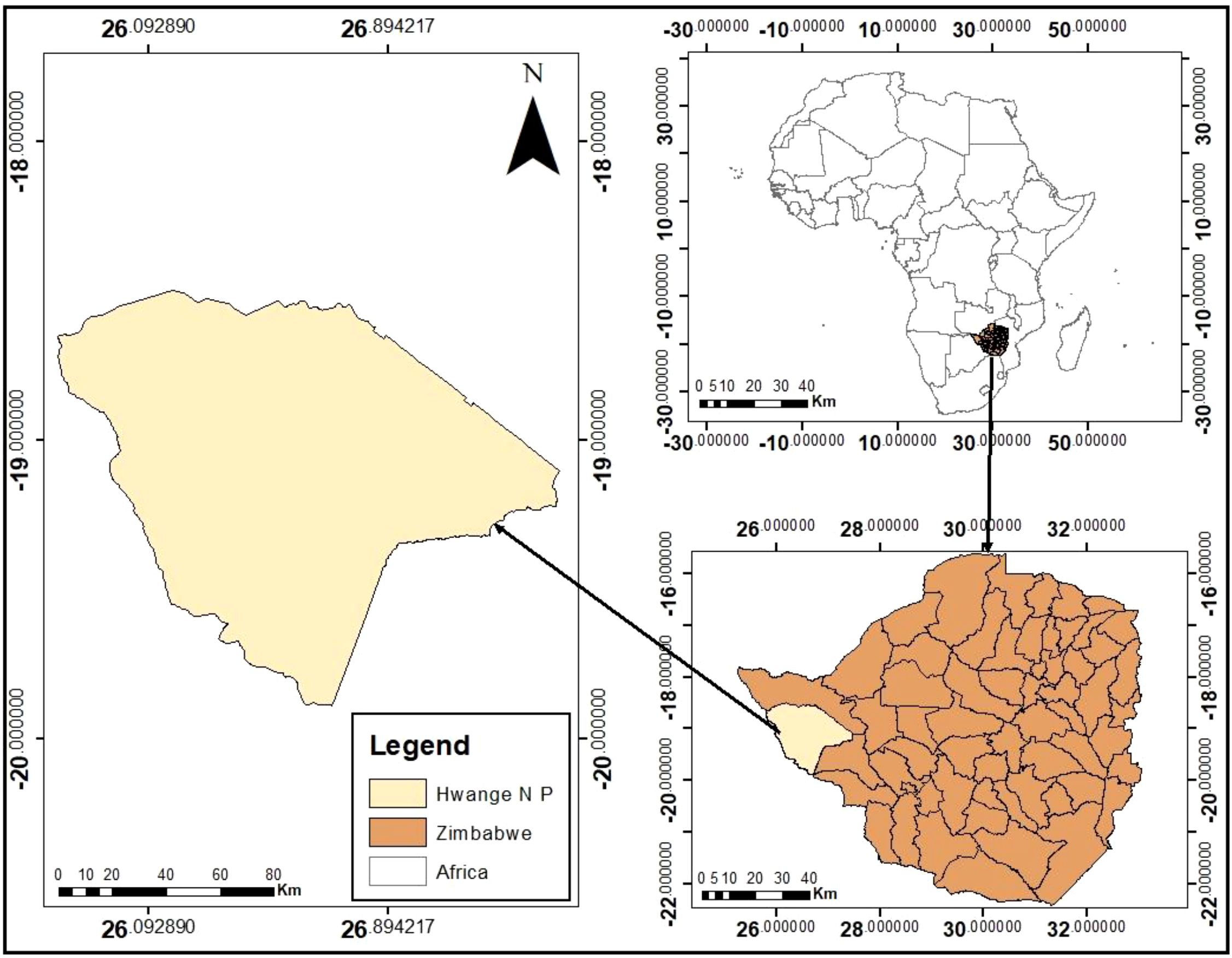 Hwange National Park (HNP), in north-western Zimbabwe (Figure 1), is the country’s largest protected area, spanning approximately 14,651 km² (Mpakairi et al., 2020). As part of the Kavango-Zambezi Transfrontier Conservation Area (KAZA TFCA), it plays a key role in supporting Zimbabwe’s elephant population. The park’s semi-arid savanna ecosystem experiences a wet season (November–April) with 570–650 mm of rainfall and a dry season (May–October) marked by scarce water availability (Mlambo et al., 2024). Due to its sandy soils and lack of permanent water sources, wildlife relies heavily on artificial waterholes, especially during the dry season. Situated in a climate-sensitive region, HNP is vulnerable to changing rainfall patterns and droughts, making it a critical area for assessing elephant habitat suitability under current and future climate scenarios.