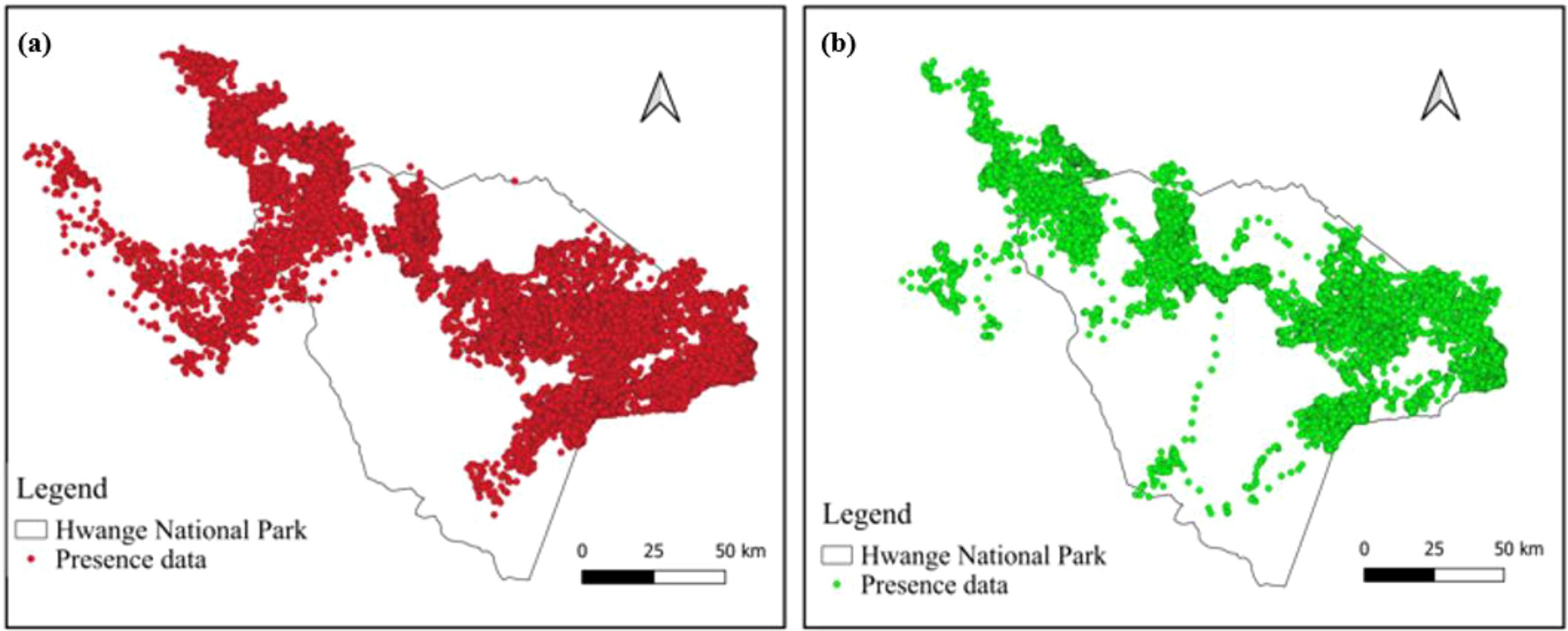 Figure 2. Spatial distribution of elephant movement data for (a) the dry season (May–October) and (b) wet season (November–April) in Hwange National Park.