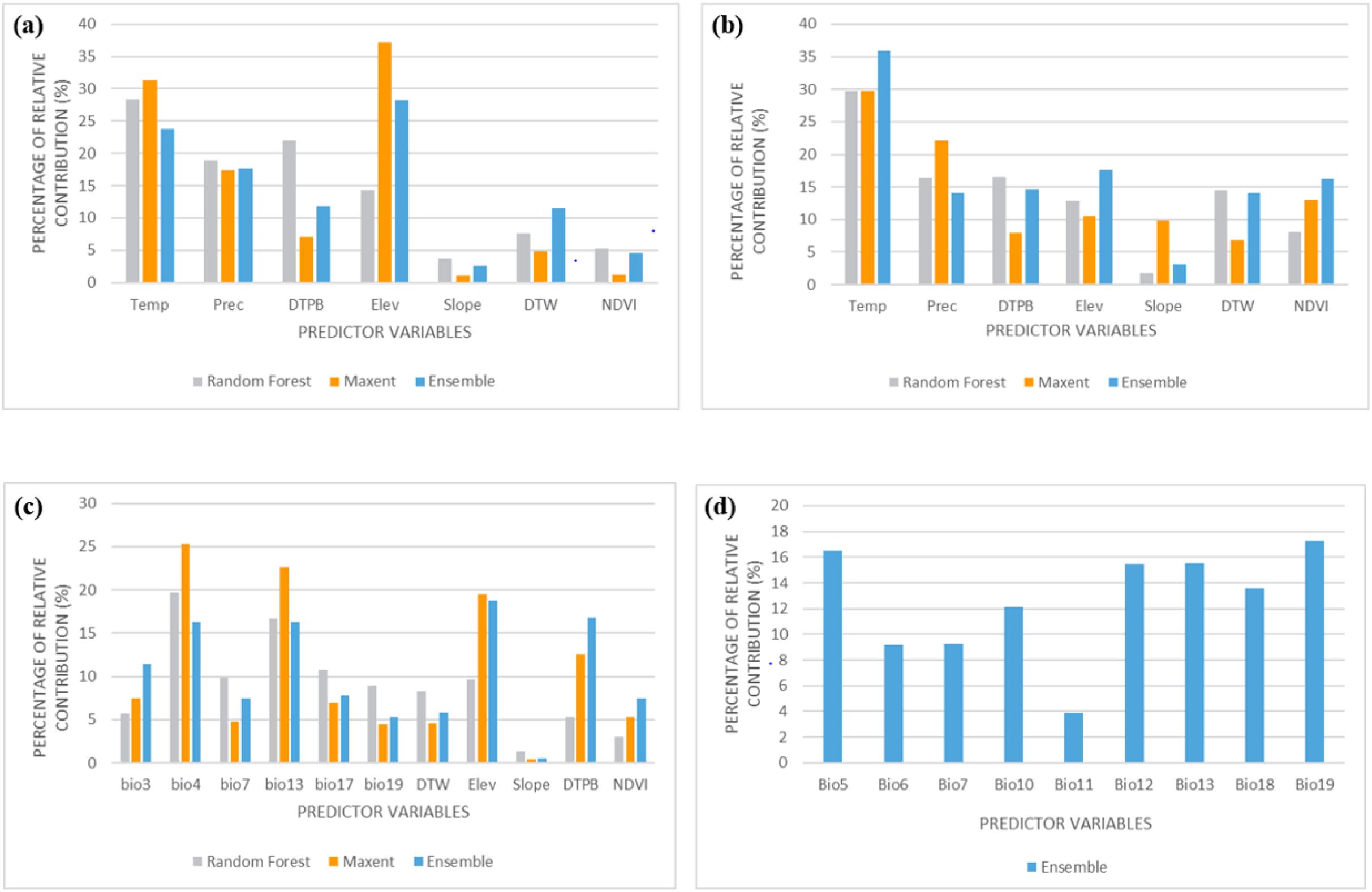 Figure 3. Variable importance for (a) wet season, (b) dry season, (c) combined presence data, and (d) bioclimatic variables used for future projections.