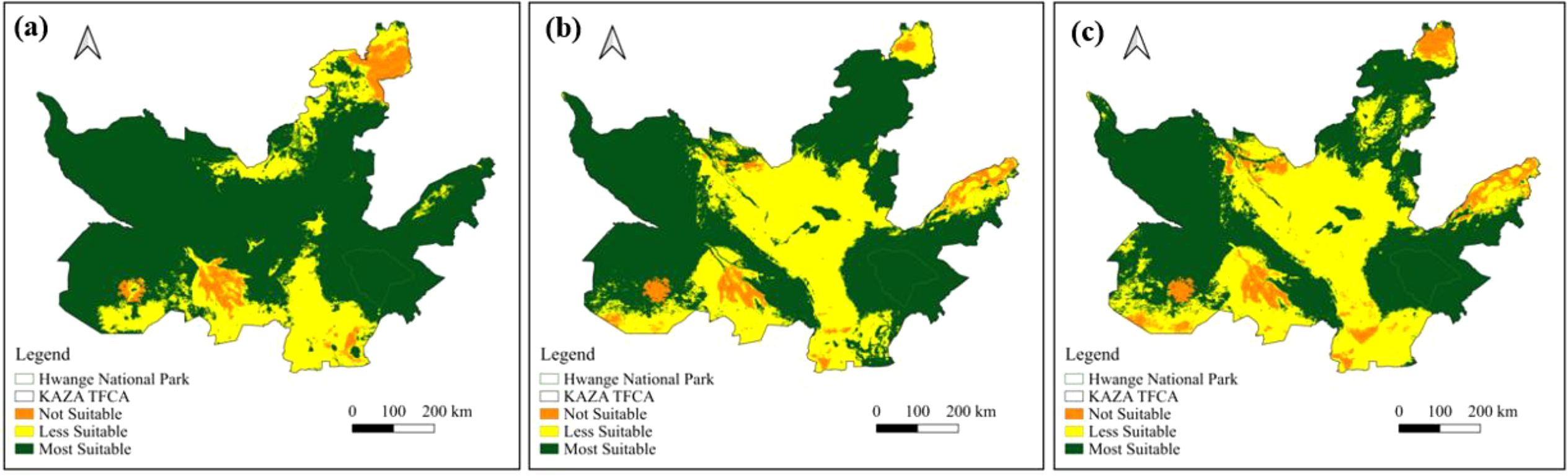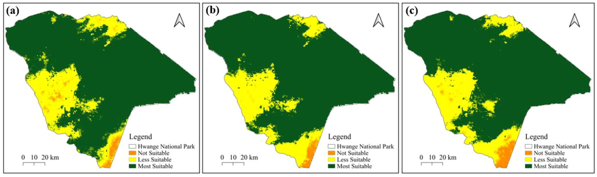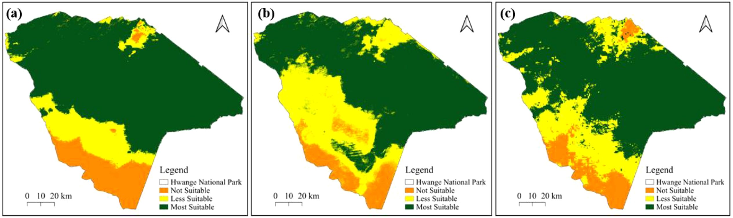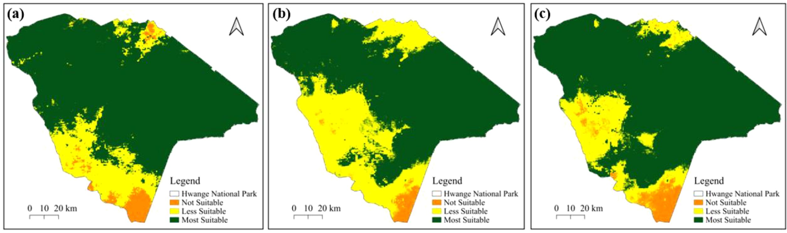Based on the current scenario, most of the landscape, especially within and around Hwange National Park, is classified as highly suitable, with less suitable and unsuitable zones mainly located in the southern and northeastern edges (Figure 7a). Projected suitable habitats for 2050 (Figure 7b), reveal a noticeable decline in suitable habitat, particularly along the park’s eastern and southern boundaries and near the KAZA edge, although core areas in Hwange remain intact. By 2070, unsuitable habitat expand further, particularly in the southern and eastern directions, while the most suitable areas become increasingly fragmented, indicating continued habitat decline (Figure 7c).