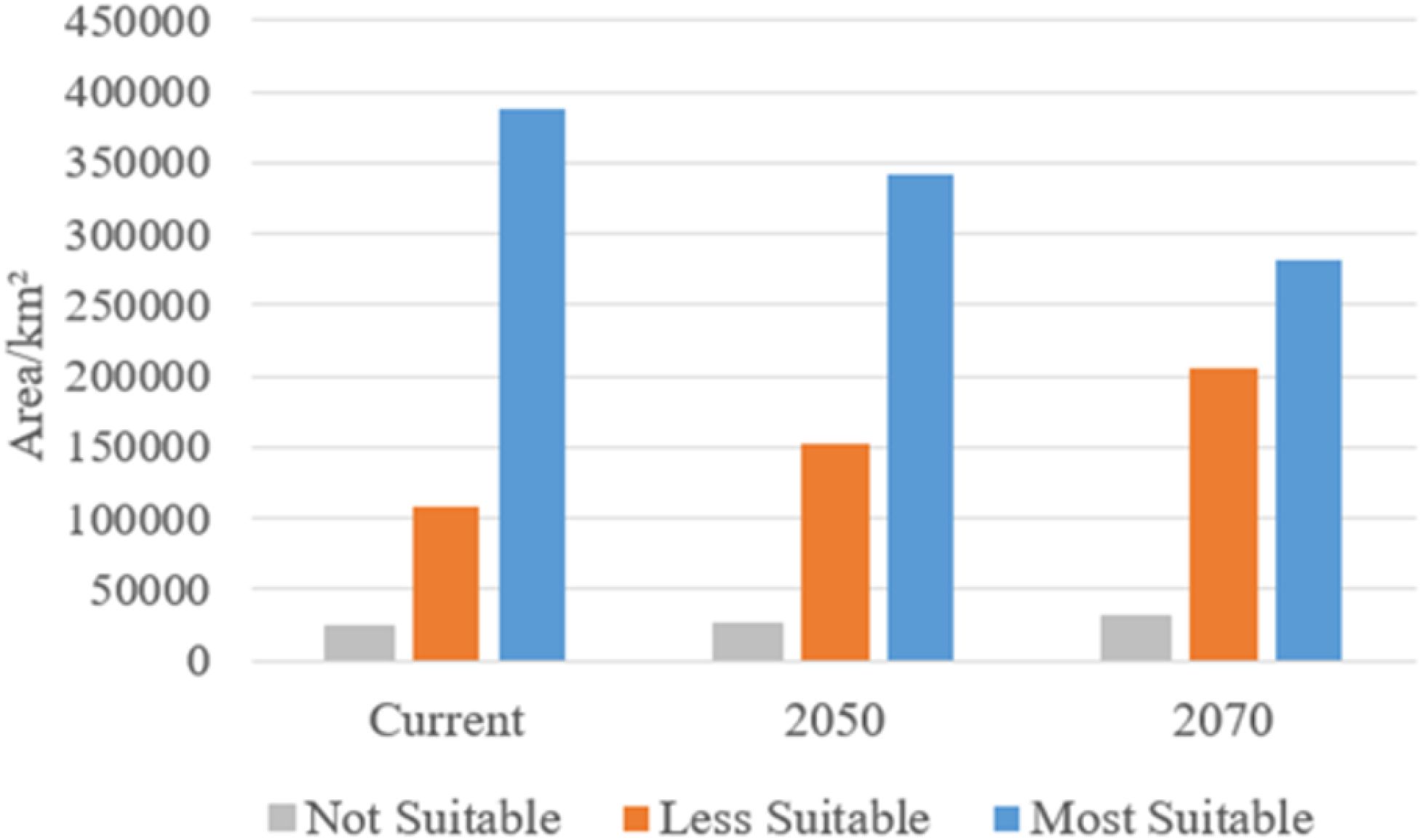 Figure 8 shows that the most suitable elephant habitat is expected to decline from 388,489.9 km² (current) to 342,698.3 km² in 2050, and further to 282,470.3 km² by 2070. Less suitable areas increase from 107,609.7 km² to 153,210.0 km² in 2050 and reach 205,429.9 km² by 2070. Not suitable areas rise slightly from 23,900.4 km² to 24,101.7 km² in 2050 and 32,099.8 km² in 2070.
