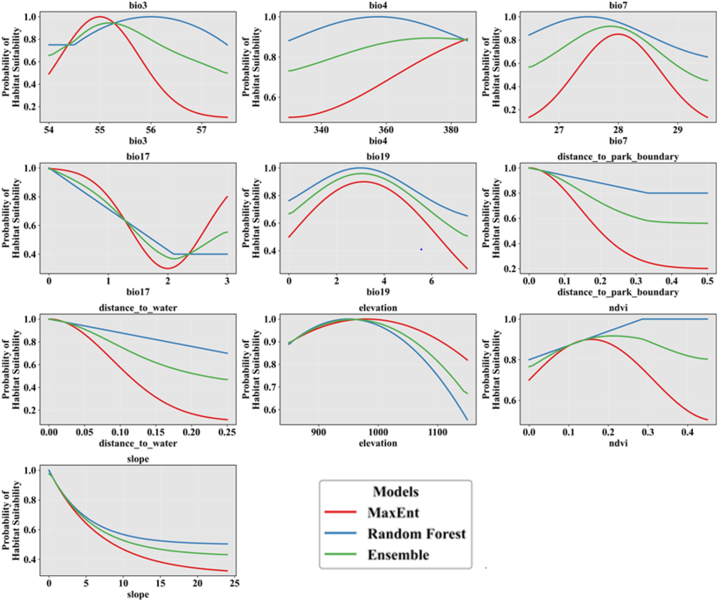 Understanding the interactions between species and their environment is essential for determining optimal habitat conditions and guiding conservation decisions. This study confirms the value of using GIS and remote sensing technologies in combination with a suit of SDMs to assess habitat suitability, especially in data-scarce regions like HNP. The integration of biophysical variables (NDVI, temperature, precipitation) with GPS data enabled the creation of ecologically meaningful seasonal and future distribution models.