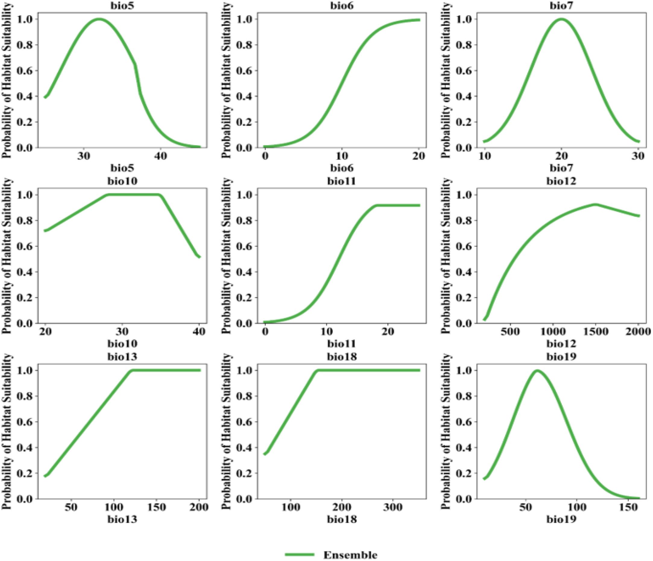Figure 10. Response curves for African elephant for different bioclimatic variables based on the ensemble model.