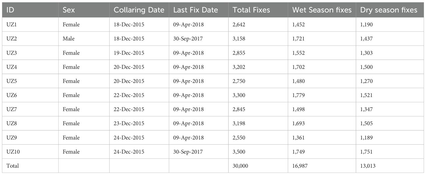 This study utilised GPS tracking data collected from African elephants (Loxodonta africana) in Hwange National Park between December 2015 and April 2018 (Mlambo et al., 2024). A total of 10 elephants (nine females and one male), (Table 1), were fitted with GPS collars, ensuring representation from different social herds to account for potential behavioral and spatial variability. The raw GPS dataset initially contained 47,500 presence records, which were subsequently cleaned and processed in ArcGIS 10.1 to remove errors, outliers, and duplicate entries, resulting in a refined dataset of 30,000 high-quality presence points.