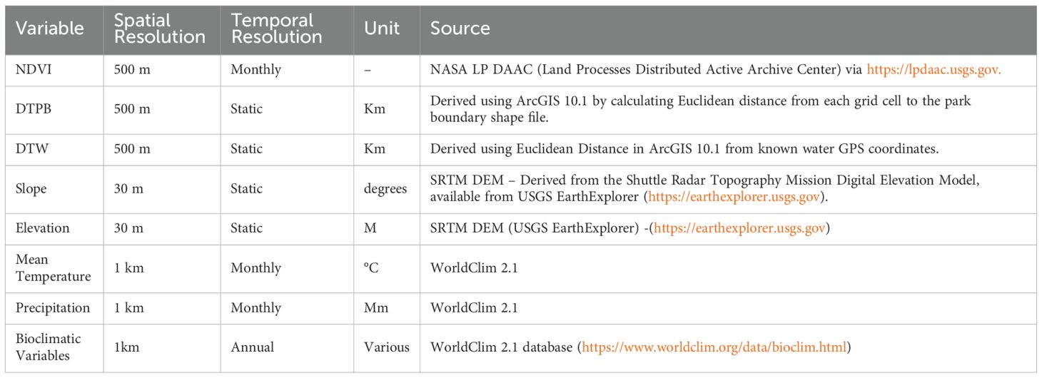 Mean monthly temperature (°C) and total precipitation (mm) were obtained from WorldClim 2.1 (Fick and Hijmans, 2017). Temperature extremes (>40 °C in October) significantly influence elephant water requirements (Chamaillé-Jammes et al., 2007), while precipitation patterns determine surface water availability. Mean temperature and precipitation were selected due to their strong influence on elephant ecology. Temperature affects thermoregulation and water needs, particularly during extreme heat (Valeix et al., 2008), while precipitation governs surface water availability and vegetation productivity, both critical for elephant survival and movement patterns (Valeix, 2011).