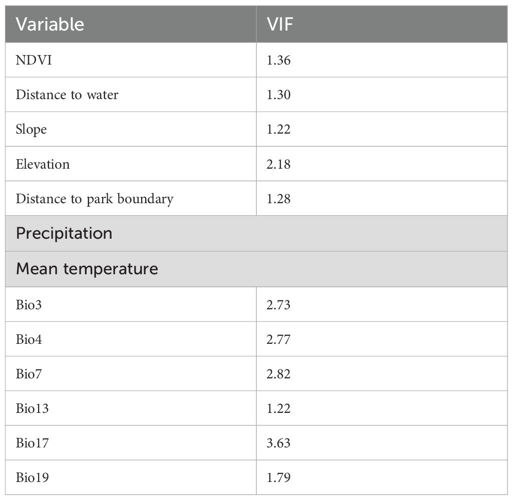 To ensure the robustness of the modelling approaches, the study carefully addressed multicollinearity among environmental predictors. Using the vifstep function from the usdm package in R (Naimi, 2016), variance inflation factors (VIFs) for all candidate variables were calculated, adopting a conservative threshold of 5 to identify and remove highly correlated predictors. This process minimised redundancy among variables while preserving ecologically meaningful predictors thereby enhancing model reliability and preventing overfitting (John et al., 2024). The final set of independent variables was then used to model elephant distribution patterns, ensuring both statistical validity and biological relevance in our seasonal assessments of elephant distribution as shown in Table 3.