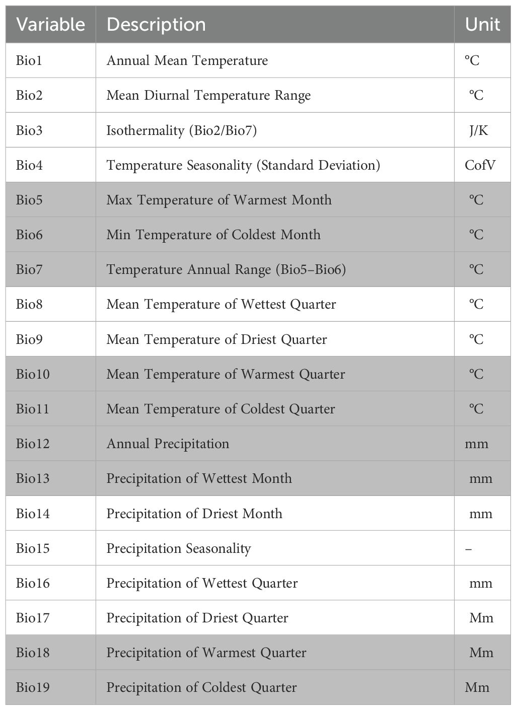Table 4 shows bioclimatic variables that were used to estimate potential distribution of suitable habitats under projected climate change scenarios.