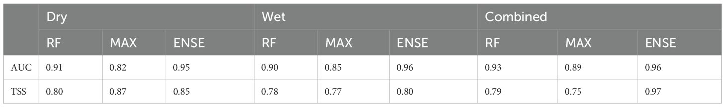 In the Dry season, Ensemble (ENSE) achieved an AUC of 0.95, outperforming MaxEnt (MAX) (0.82) and Random Forest (RF) (0.91). For TSS, MaxEnt scored the highest at 0.87, followed by Ensemble (0.85) and Random Forest (0.80). Under wet season, the Ensemble model showed the best AUC performance (0.96), while Random Forest and MaxEnt scored 0.90 and 0.85, respectively. Overall, the Ensemble model demonstrates consistent and high performance across all conditions, particularly in AUC, while MaxEnt shows variability, excelling in TSS under Dry conditions but lagging in others as shown in Table 5.