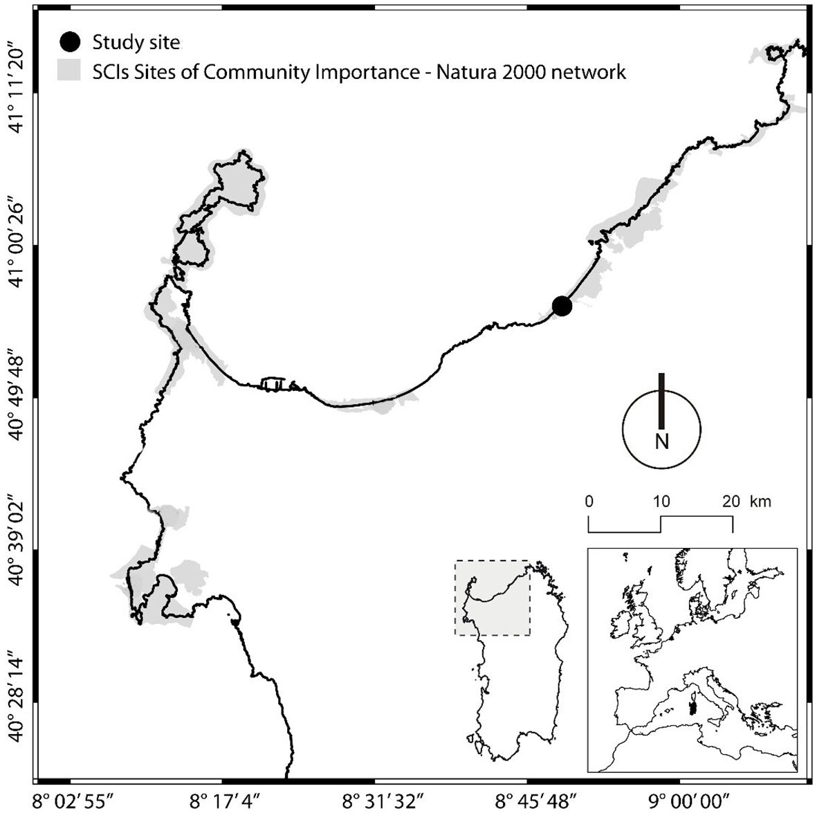 Figure 1. Location of the study area and sampling site named Li Junchi in the northern coast of Sardinia (Italy).