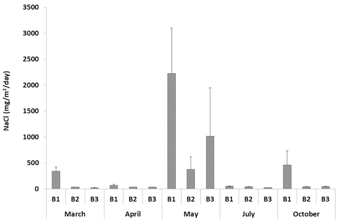 Then, a proportion was applied for calculating the salt quantity (mg) deposited on the filter surface (17.3406 cm2). Finally, averaging for the total number of days of exposure of the cellulose filter on the dune, the amount of deposited salt on the filter was referred to the daily unit and to the area unit (1 cm2), to obtain a measure of mg/cm2/day.