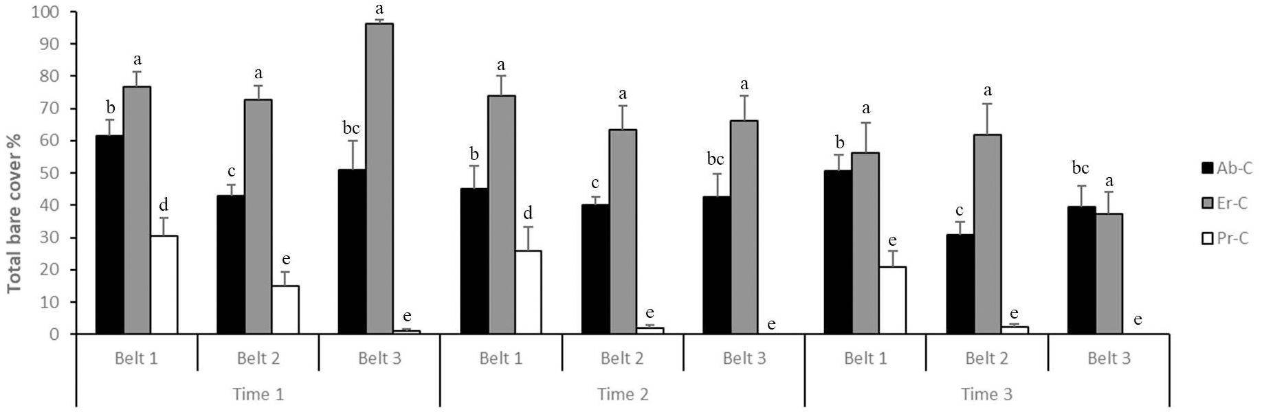 Specifically (Figure 4), the bare soil cover decreased from time 1 to time 2 and time 3 (49.73%, 39.87%, and 33.24%, respectively); it also decreased from belt 1 (49.02%) to belt 2 (36.71%) and belt 3 (37.11%). Lastly, it reached its maximum average in Er-C plots (67.14%), averaged in Ab-C plots (44.89%), and reached its minimum average in Pr-C (10.81%).