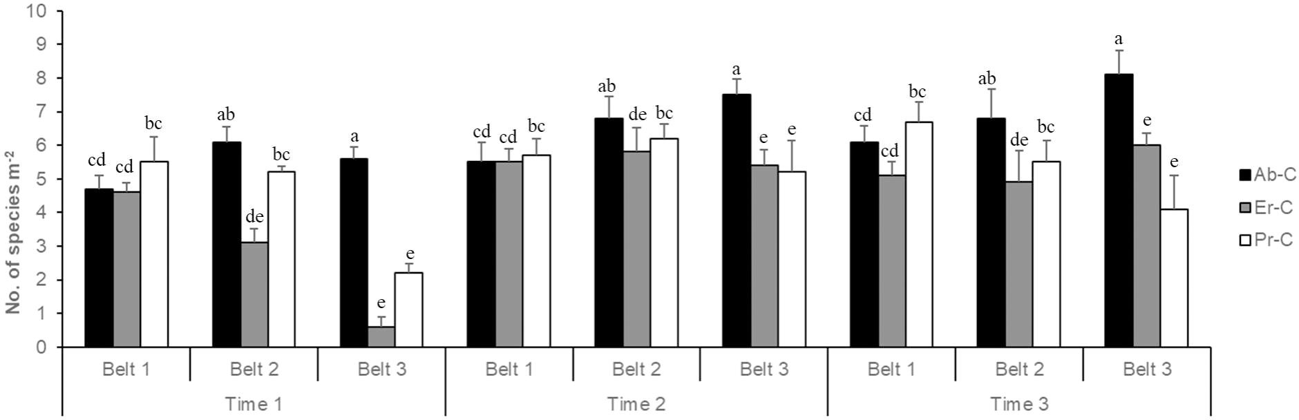 Overall, the average number of species was lower at time 1 (4.18 species m−2) and higher at time 2 (5.96 species m−2) and time 3 (5.92 species m−2); it was lower in belt 3 (4.97 species m−2) and higher in belt 1 (5.49 species m−2) and belt 2 (5.60 species m−2) (Figure 5). Finally, the number of species was higher in Ab-C (6.36 species m−2), average in Pr-C (5.14 species m−2), and lower in Er-C (4.56 species m−2).