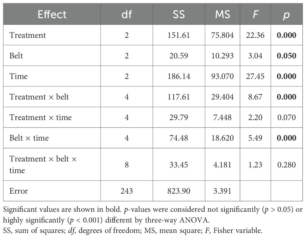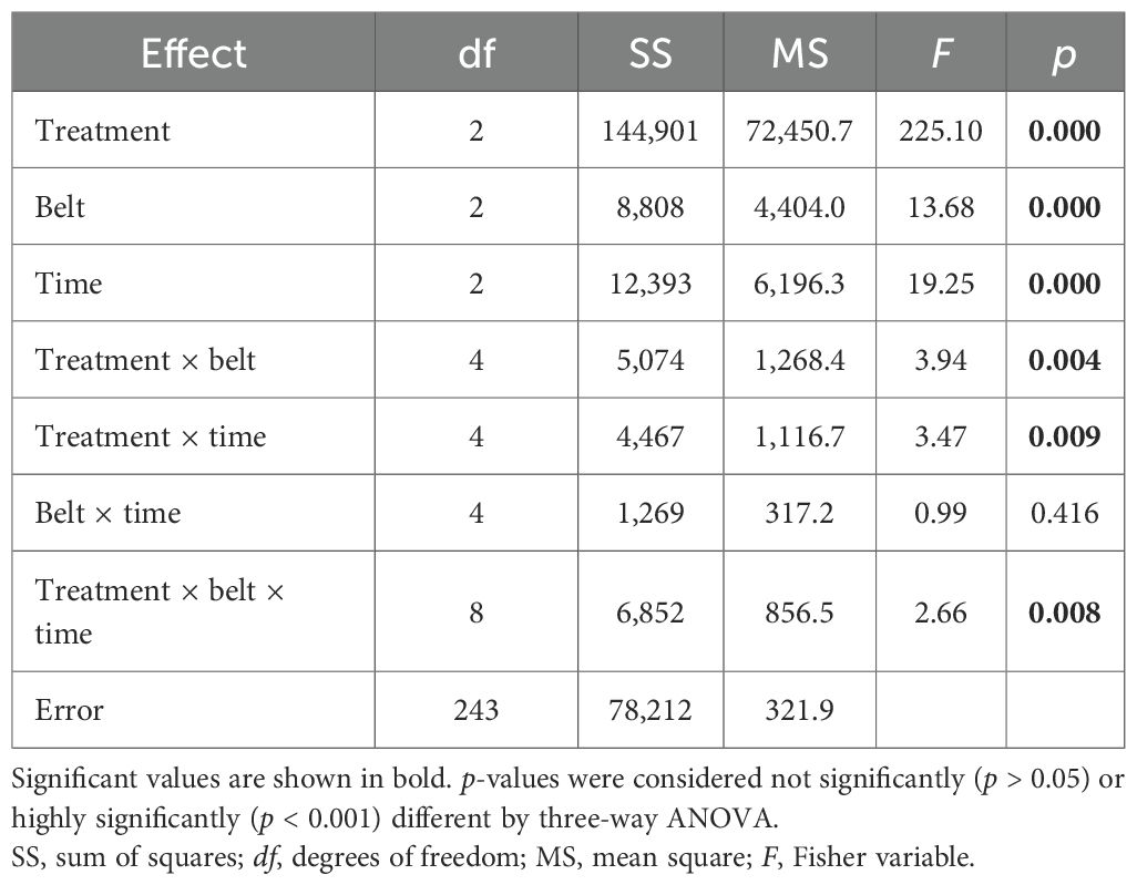Three-way ANOVA for Shannon and Weaver’s diversity index (H′; Table 3) showed that all factors and their interactions have a strong impact. Fisher’s least significant difference post hoc test for the treatment factor showed significant differences in H′ between Er-C and the other two treatments in belt 2 at all three times; however, in belt 3 at all times, a significant difference was shown between Er-C and Ab-C. Finally, in belt 1, at any time, no significant differences in H′ were recorded between Er-C and the other two treatments.