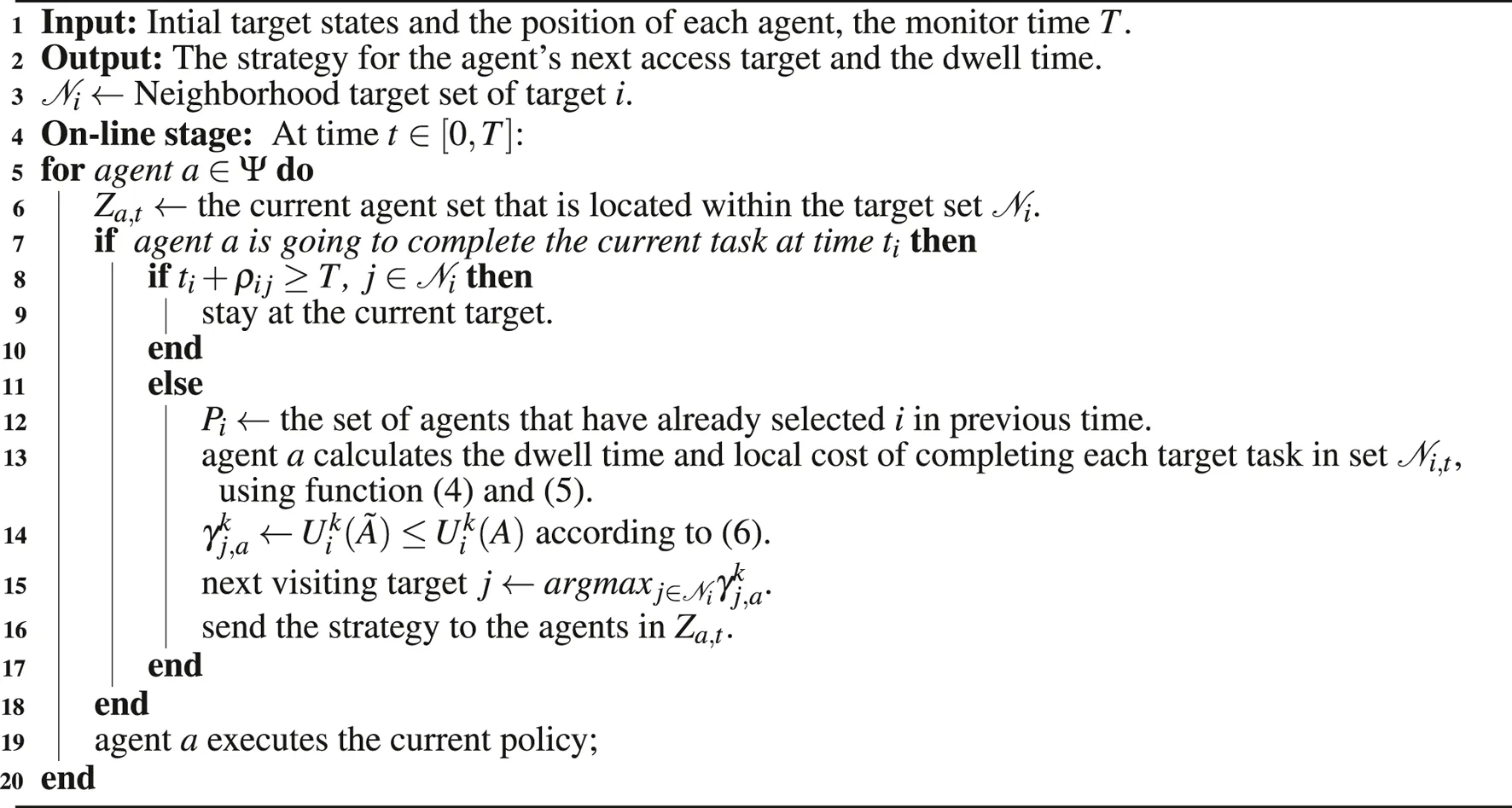 A distributed greedy algorithm is proposed in this section, which does not require synchronous actions of agents, meaning that at each visiting time t, an agent takes its action independently, and the motion of an agent is determined by the completion of the event of monitoring the current target. If the agent is going to move, then the agent will perform the decision-making procedures as shown in algorithm 1. Otherwise, the agent will continue to execute the previous strategy.