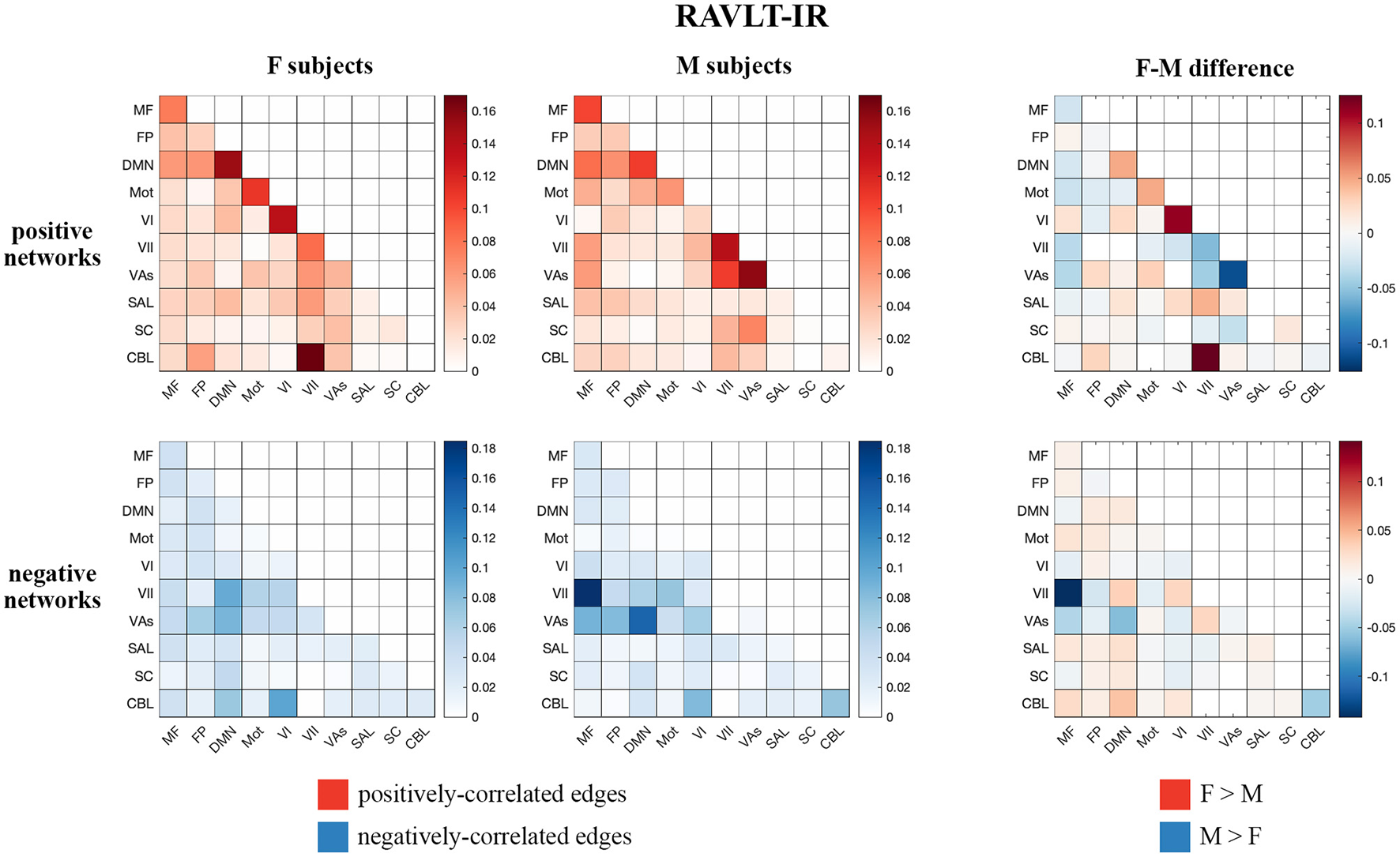 Positive and negative matrices from the RAVLT-IR-predicting model showing inter-network connections (number of significant edges normalized by network size for each network pair) for female and male subjects, as well as the difference between both sexes (derived by subtracting male inter-network edges from female inter-network edges). Both sexes show positive predictors in the intra-DMN edges. Female subjects show more positive predictors in the intra-VI-network edges relative to male subjects, while male subjects show more positive predictors in the intra- and inter-visual-(VII and VAs)-network edges relative to female subjects. Negative predictors of both sexes relied on edges between DMN and visual networks; however, male subjects' negative predictors relied more on edges between the MF and VII networks than those of female subjects (F, female; M, male; MF, medial frontal; FP, fronto-parietal; DMN, default mode network; Mot, motor; VI, visual I; VII, visual II; VAs, visual association areas; SAL, limbic; SC, basal ganglia; CBL, cerebellum; RAVLT-IR, RAVLT-Immediate Recall).