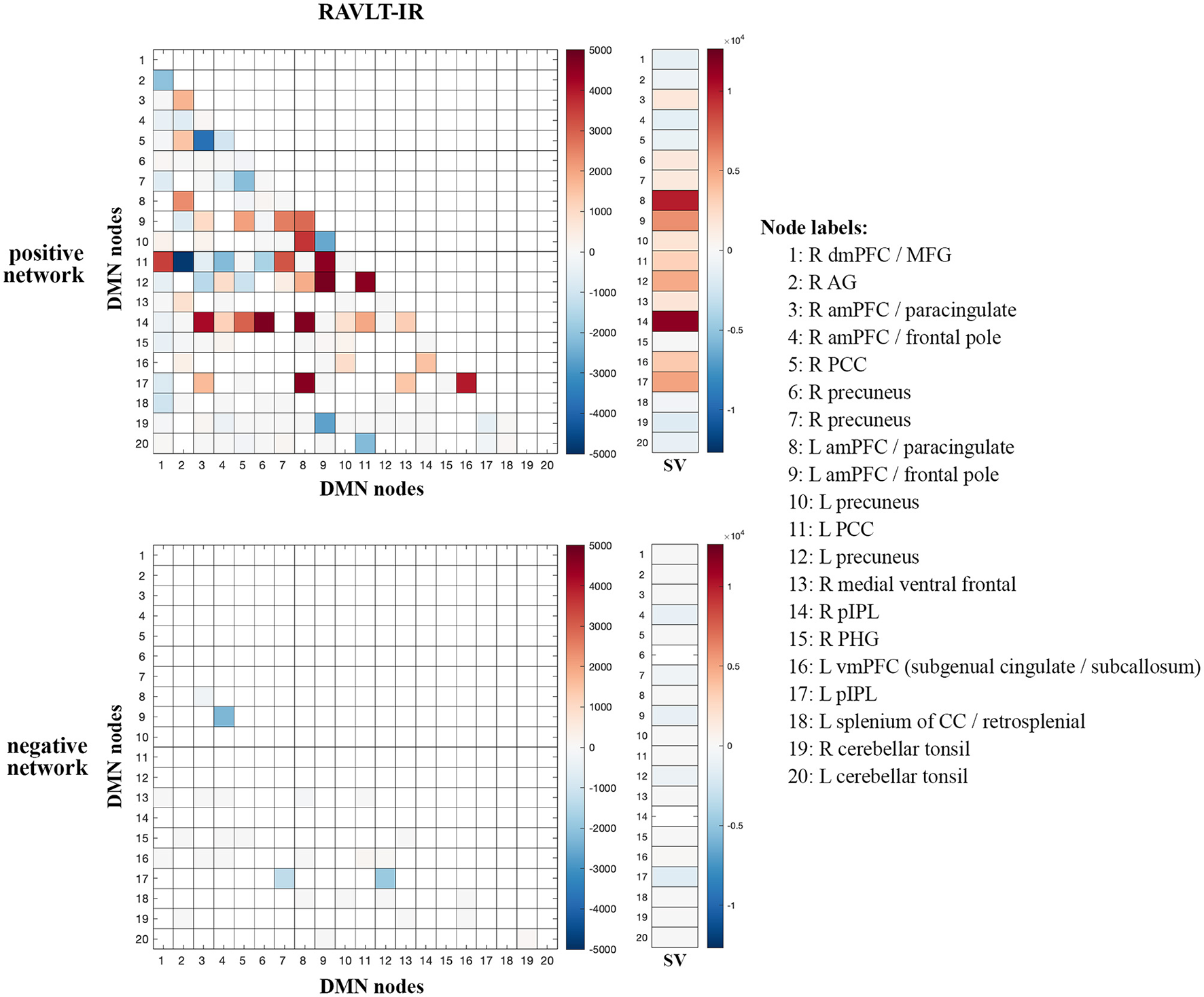 Intra-DMN connectivity differences between males and females. Intra-DMN edge counts from the RAVLT-IR models were calculated and plotted as a heat map (female-male edge counts). Red indicates higher female counts and blue indicates higher male counts for each edge (RAVLT-IR, RAVLT-Immediate Recall; L, left; R, right; dmPFC, dorsomedial prefrontal cortex; MFG, middle frontal gyrus; AG, angular gyrus; aMPFC, anterior medial prefrontal cortex; PCC, posterior cingulate cortex; pIPL, posterior inferior parietal lobe; PHG, parahippocampal gyrus; vmPFC, ventromedial prefrontal cortex; CC, corpus callosum; SV, summed vector).