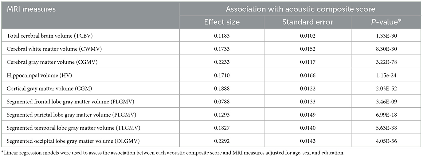 Here, m refers to the count of acoustic features that exhibit a significant association with the MRI measure. The estimate of effect size for acoustic feature j obtained from the linear regression model is represented by αj, while Vij denotes the normalized acoustics feature j for participant i. All models were adjusted for age, sex, and education.