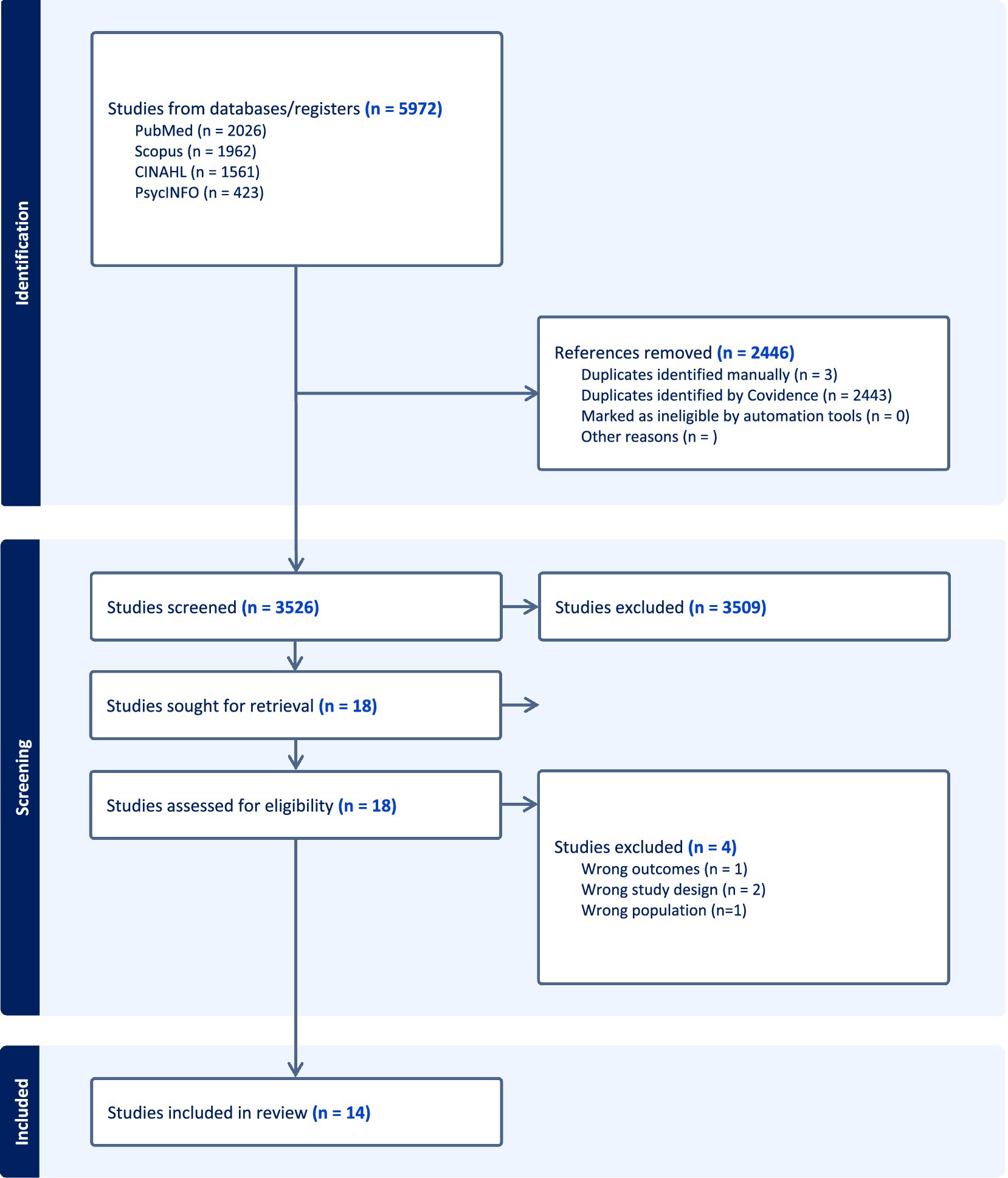 In total, 5,972 citations were identified and uploaded to Covidence. After removing duplicates, 3,526 titles and abstracts were screened, of which 3,509 were excluded and 18 were assessed for eligibility. A total of four studies were excluded (wrong outcomes, n = 1; wrong study design n = 2; wrong population, n = 1). 14 studies were included in our final analysis (Figure 1).