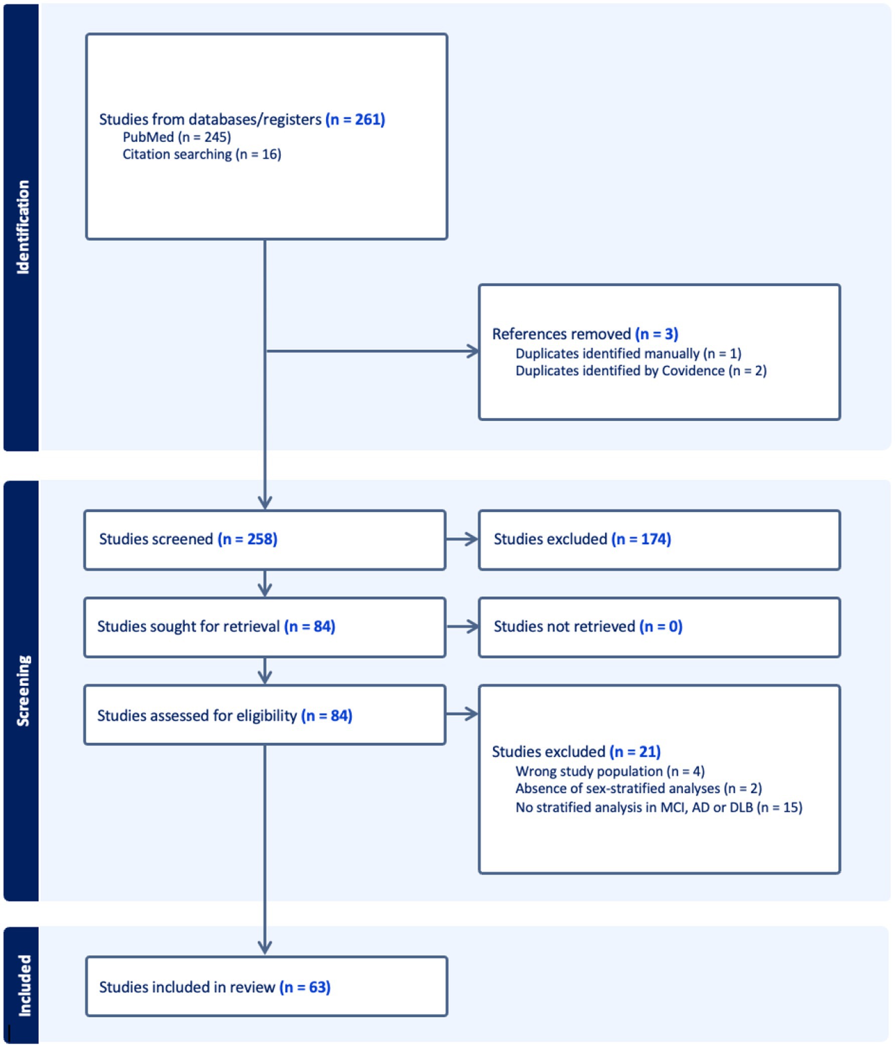 A total of 261 records were imported for screening (245 from PubMed, 16 through citation searching). After removing 3 duplicates, 258 studies remained for screening. Of these, 174 were excluded during title and abstract screening for not meeting eligibility criteria. The remaining 84 full-text articles underwent a detailed eligibility assessment, after which 21 studies were excluded resulting in a final inclusion of 63 studies. The complete study selection process is illustrated in the PRISMA flow diagram (Figure 1). Of the included studies, 50 were cross-sectional and 13 were longitudinal in design. Regarding patient populations, 22 studies examined combined AD dementia and MCI due to AD cohorts, followed by 16 focused on MCI due to AD, 13 on AD dementia, 11 on DLB, and 1 study included both AD dementia and DLB groups. Studies were categorized into four biomarker modalities: Biofluid markers (n = 18), structural imaging (n = 18), functional imaging (n = 16), molecular imaging (n = 11). Figure 2 presents an overview of the included studies, whereas Figure 3 depicts an alluvial plot visualizing the relationships between study designs, patient populations, and distribution of biomarker modalities across the literature. A summary of the principal sex-related biomarker patterns across modalities is presented in Table 1.
